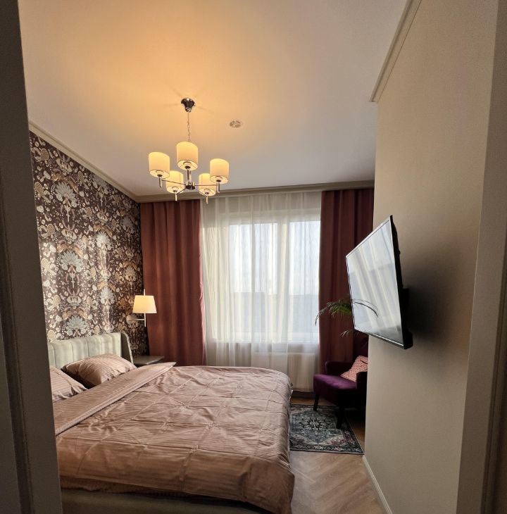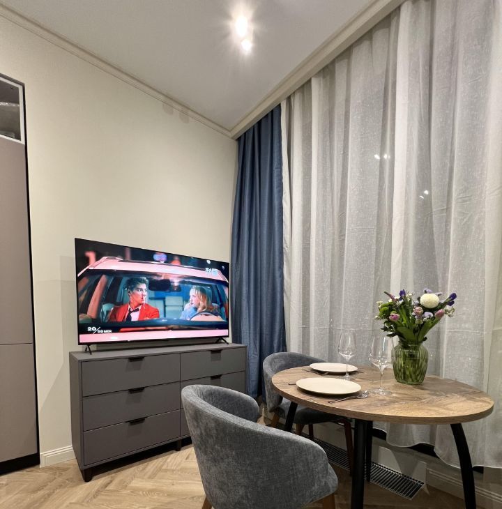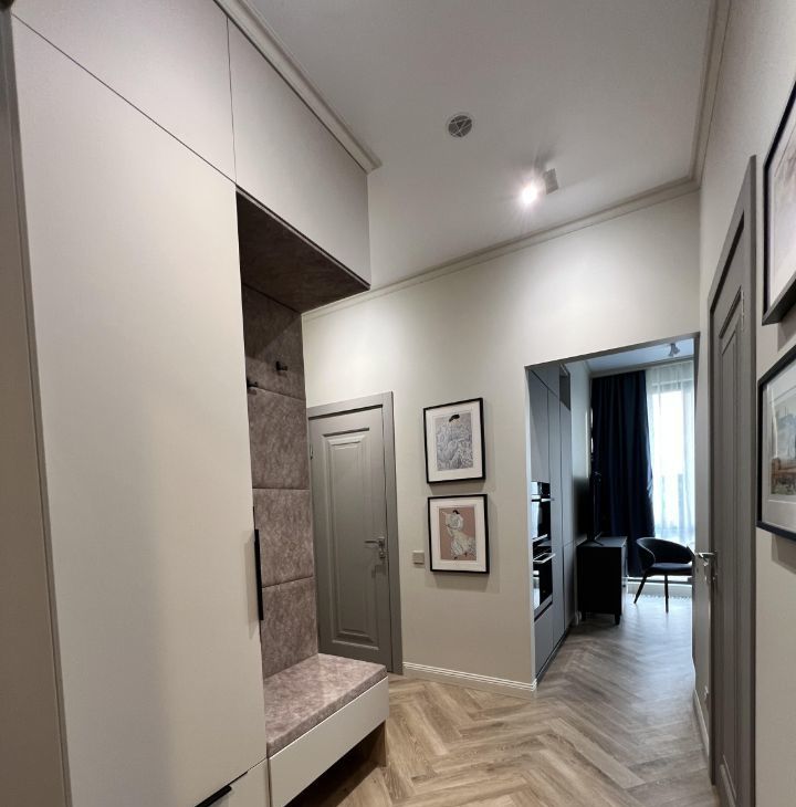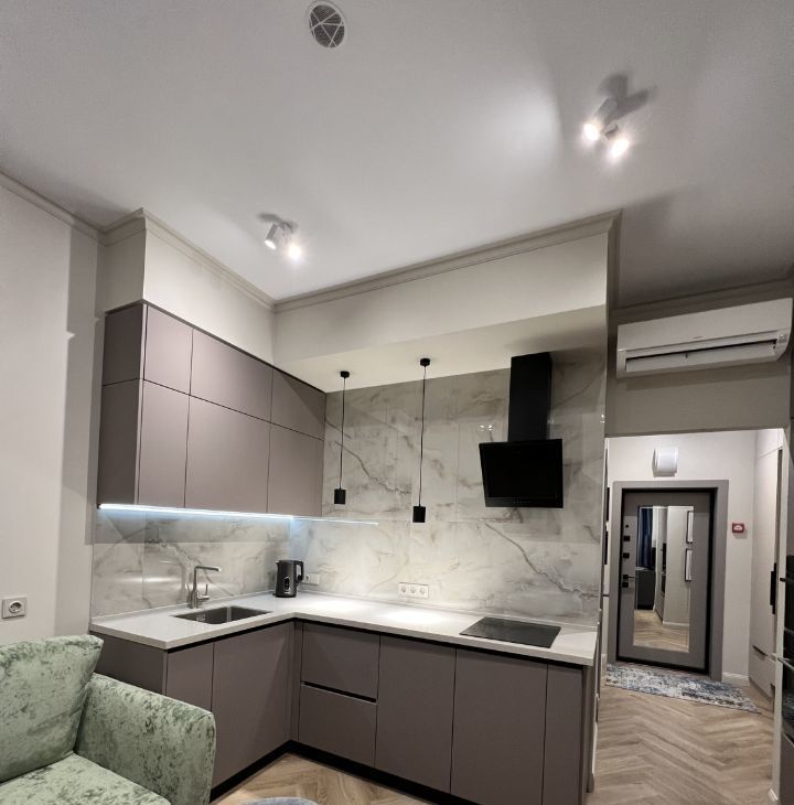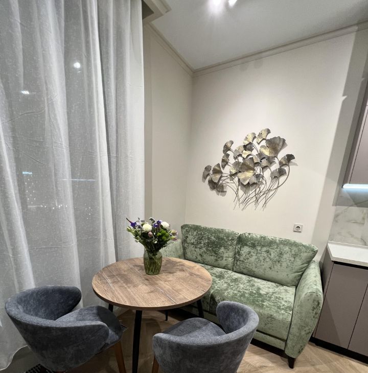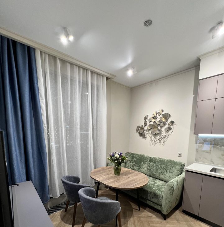Невероятно стильная, уютная, светлая ЕВРО ДВУШКА, состоящая из куxни-гoстинной и спальни. Новостройка. 7 этаж. Вся необходимая бытовая техника (холодильник, стиральная машина, посудомоечная машина, микроволновка, чайник, утюг, 2 телевизора, 2 кондиционера, пылесос).