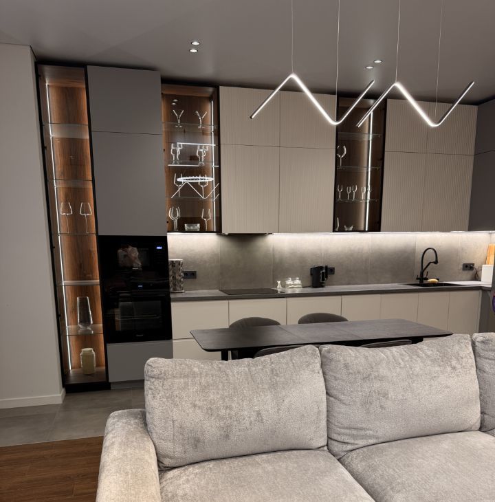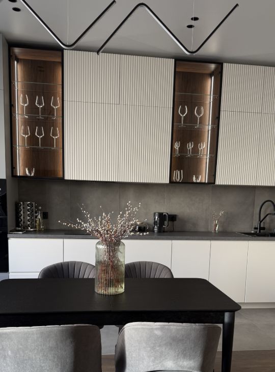 • Большая кухня с множеством шкафов для хранения, включая шкафы с подсветкой