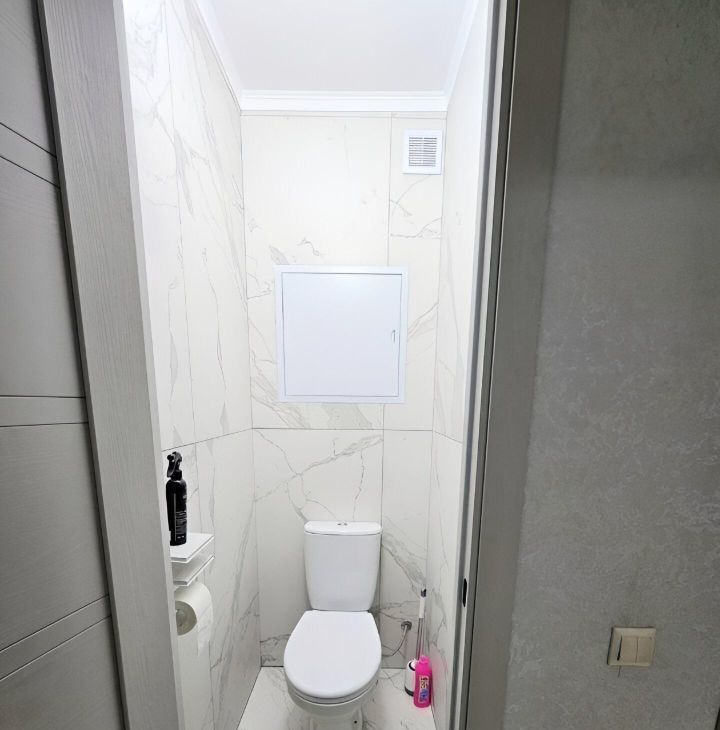 Cанузeл pаздельный, офopмлен в светлыx тонаx c кaчествeнной плиткой.