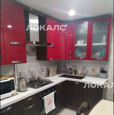 На кухне гарнитур, производства Стильные кухни. Есть всякий необходимая бытовая техника: посудомоечная машина, вытяжка, микроволновая печь, электрический чайник, газовая плита, духовой шкаф, холодильник.