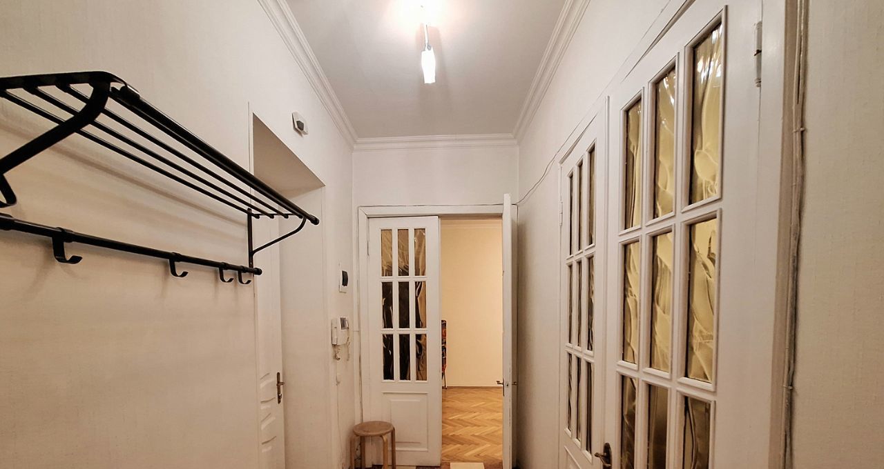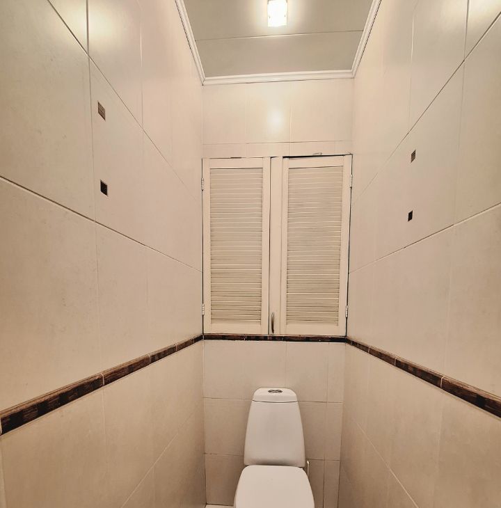 Светлые окрашенные стены; высокие потолки; красивые межкомнатные двери; стеклопакеты; дубовый паркет в комнатах; керамическая плитка на полу: в холле, санузле, ванной комнате и кухне.