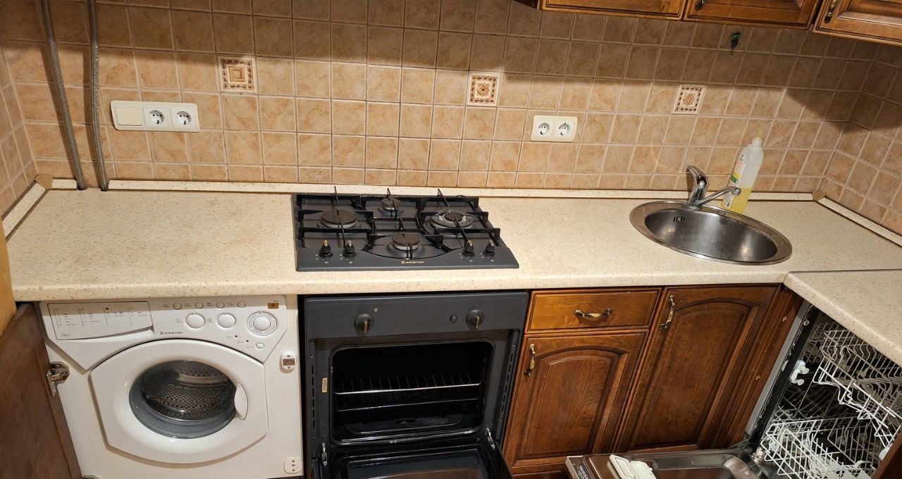 Встроенная кухня укомплектована бытовой техникой: посудомоечная и стиральная машины, холодильник, духовка, варочная панель, вытяжка.
