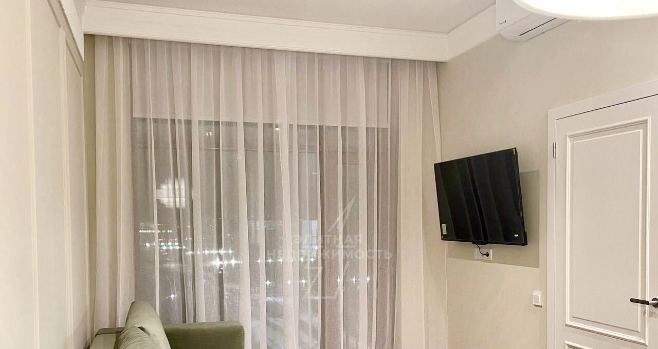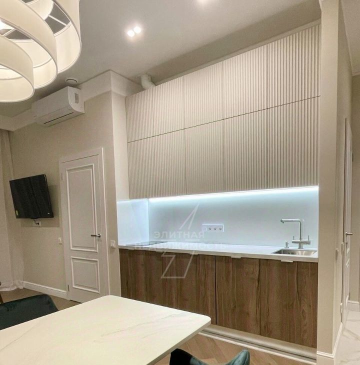 Кухня-гостиная с ТВ с Алисой, раскладывающимся диваном, и журнальным столиком,
