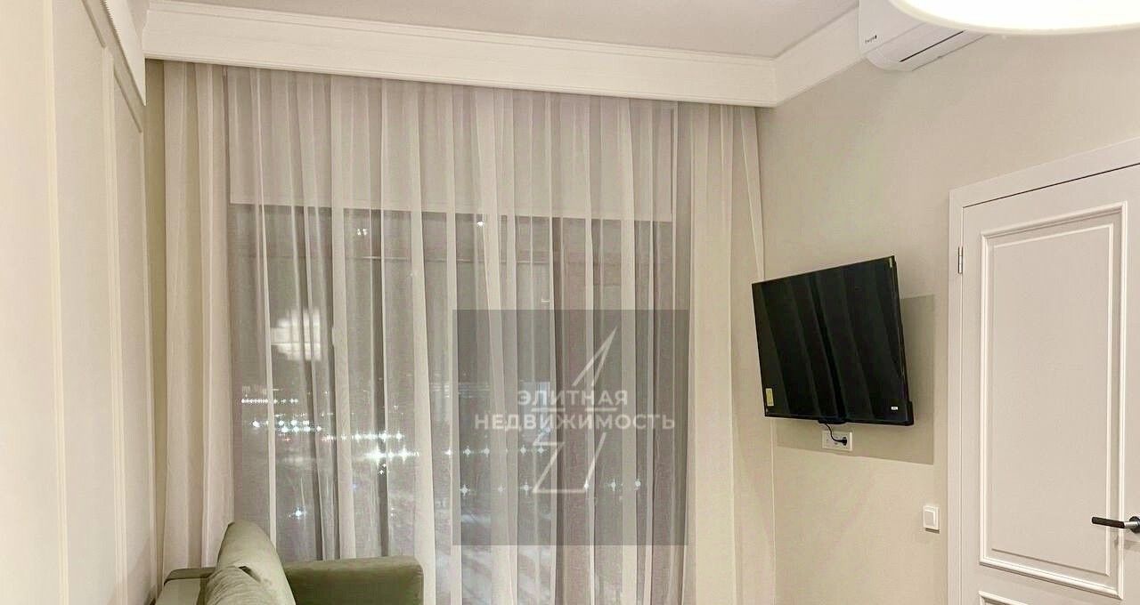 Кухня-гостиная с ТВ с Алисой, раскладывающимся диваном, и журнальным столиком,