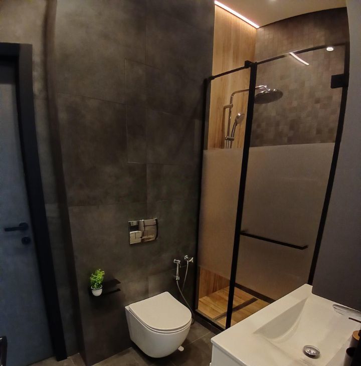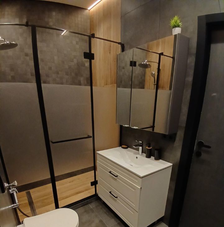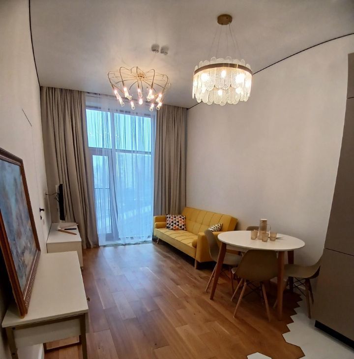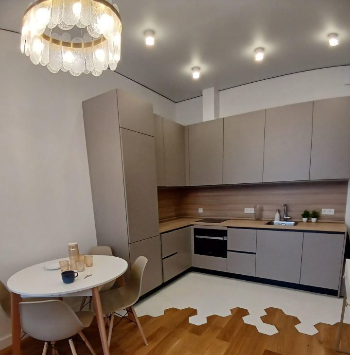 Квартира выполнена в дизайнерском стиле, что создает атмосферу уюта и современности. В апартаментах есть все для комфортного проживания: кондиционер, холодильник, посудомоечная и стиральная машины, телевизор. Кухня оборудована всей необходимой мебелью и техникой, а в комнате предусмотрена удобная мебель для отдыха. Так же в апартаментах расолржена вместительная гардеробная со встроенной системой хранения. Санузел совмещенный, с современной душевой кабиной.