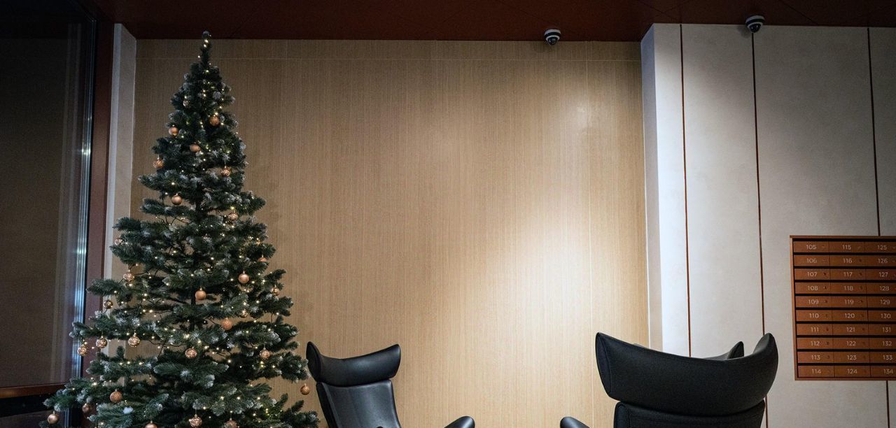 Закрытый внутренний двор с ландшафтным дизайном. Деревья, кустарники, детская площадка, современные зоны для отдыха с подсветкой.