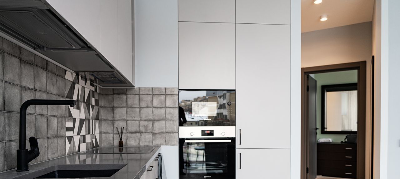 Апартамент укомплектован посудой и встроенной техникой: холодильник, стиральная машина, посудомоечная машина, микроволновая печь, система кондиционирования и др.