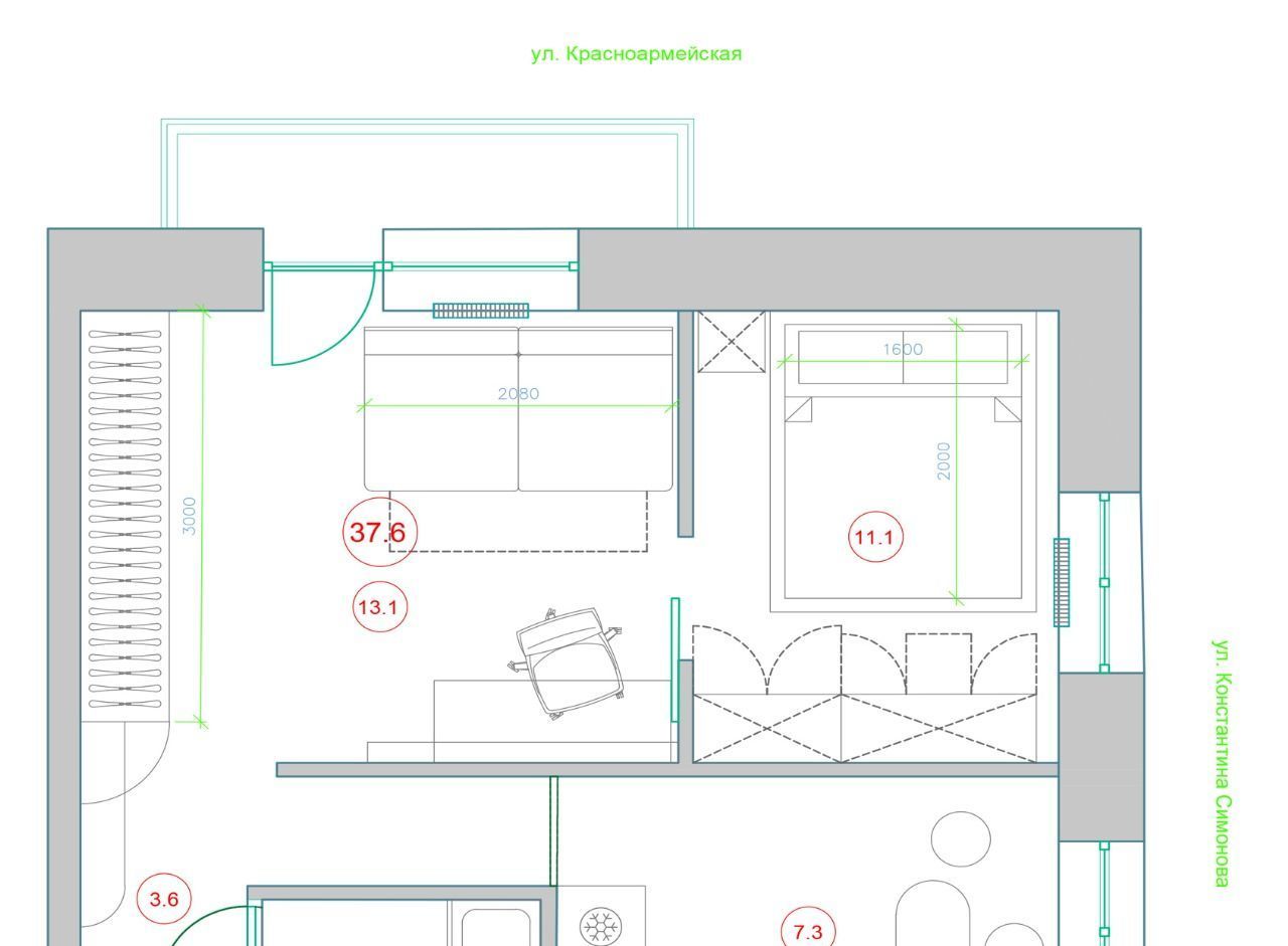 Планировка квартиры: изолированная спальня 11,1 кв.м., гостиная 13,1 кв.м. с застекленным балконом, кухня 7.3 кв.м., совмещенный с/у.