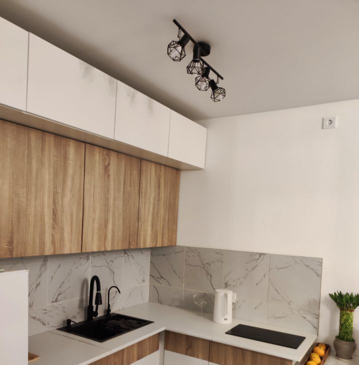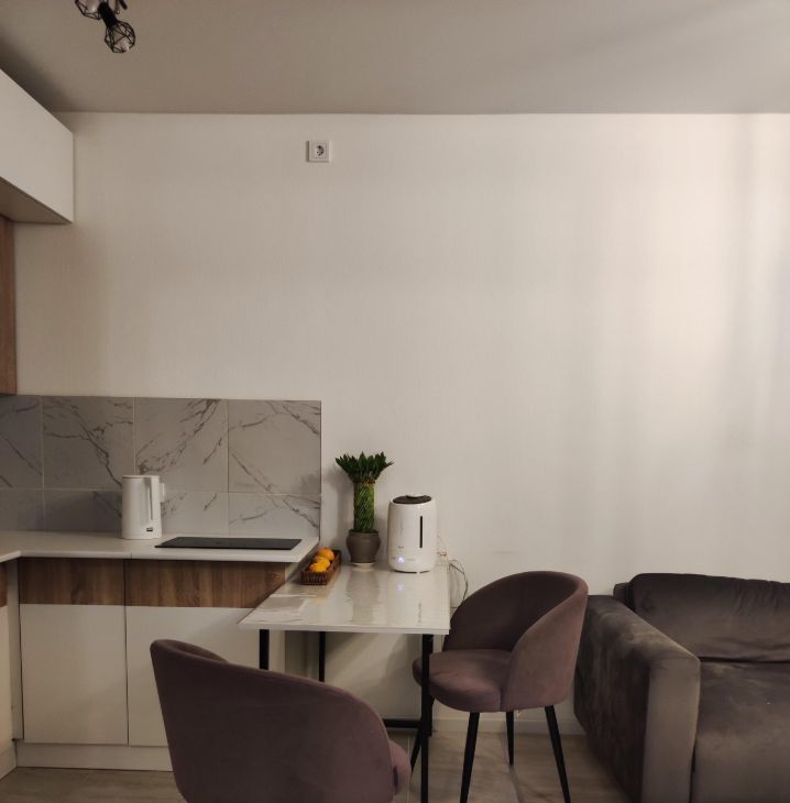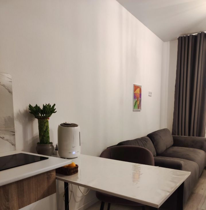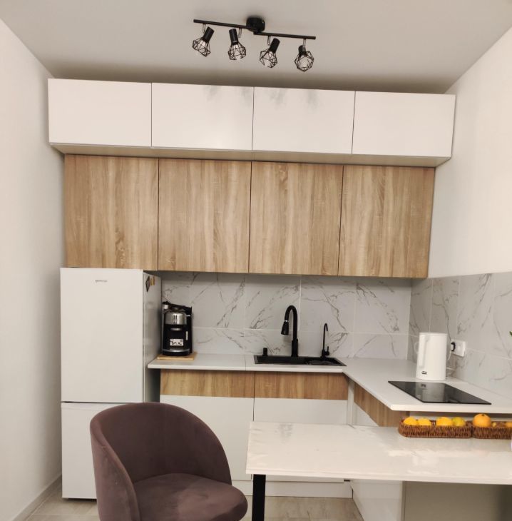 - Просторная кухня-гостиная оснащена современным кухонным гарнитуром, холодильником, электрической варочной панелью, микроволновой печью, электрическим чайником, встроенной системой для фильтрации питьевой воды (ОСМОС), удобным обеденным столом со стульями.