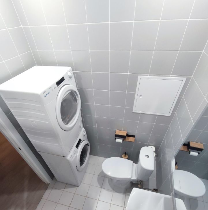 - Совмещённый санузел: ванная, стиральная и СУШИЛЬНАЯ машины, вместительный навесной шкаф с зеркалом.