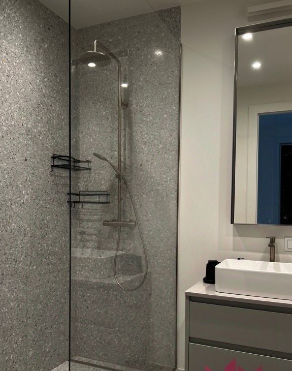 Санузлы облицованы керамогранитом и бетонной плиткой Терраццо. Сантехника марки Villeroy&Boch.