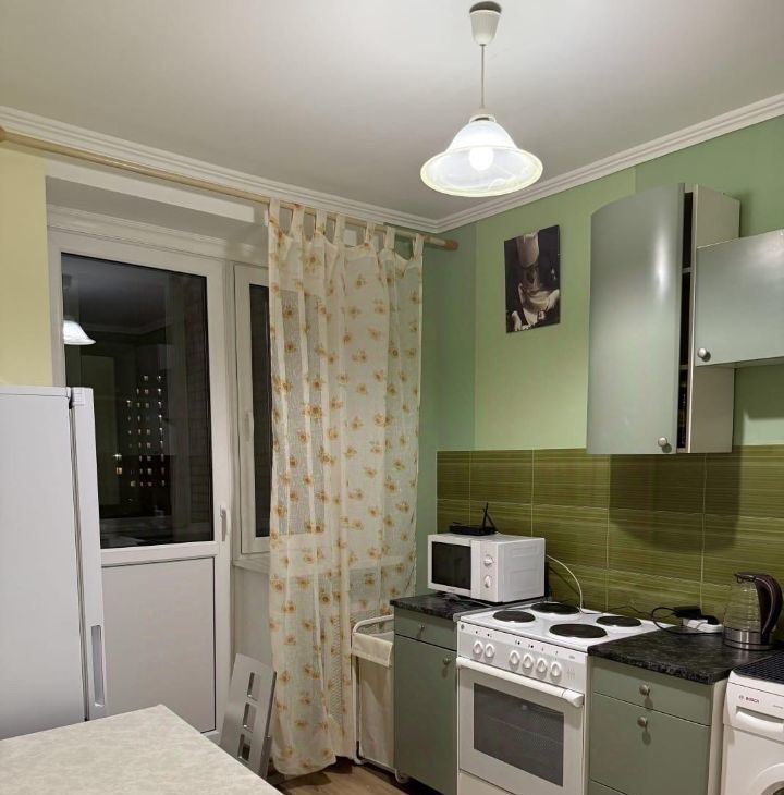 Кухня: встроенный кухонный гарнитур, эл.плита, стиральная машина, печь СВЧ.