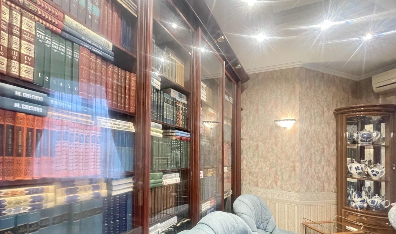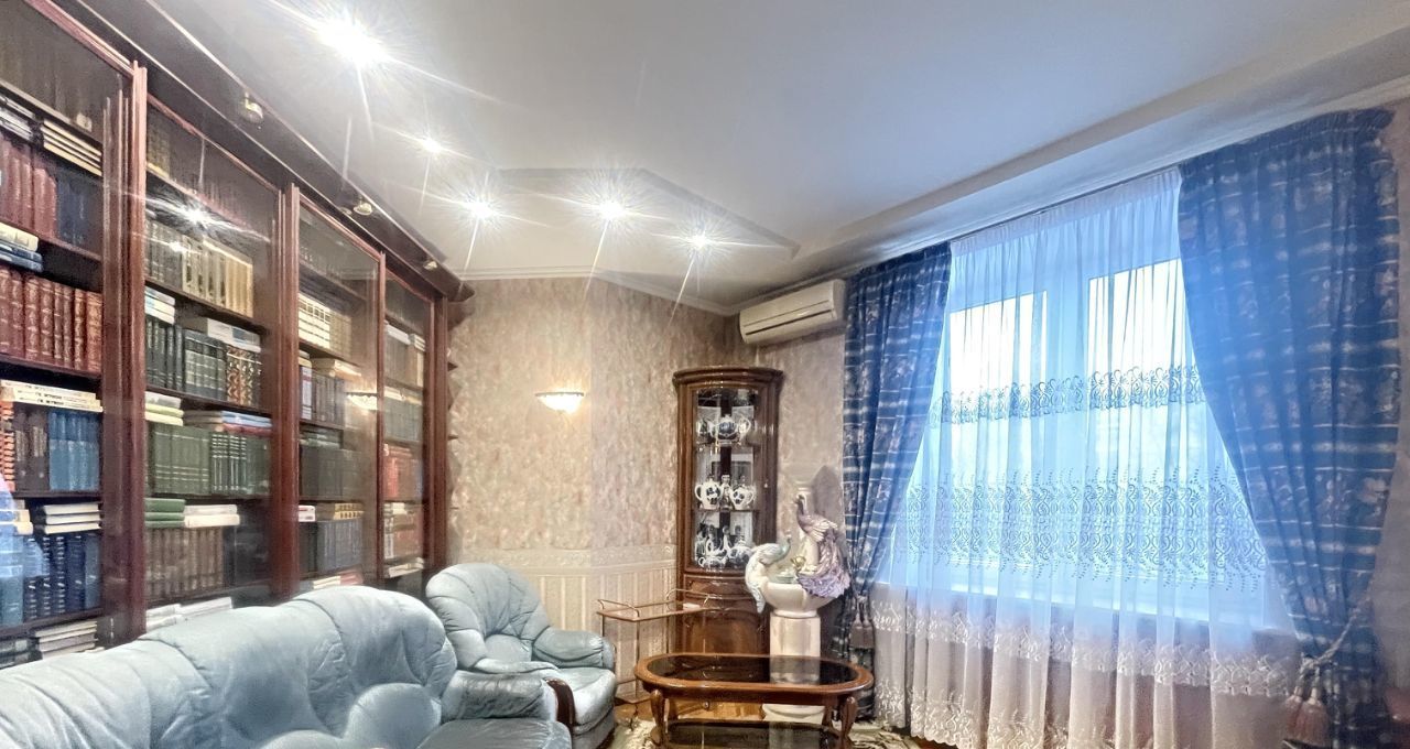 Просторная кухня- гостиная с мягким диваном и библиотекой. Встроенная кухонная мебель со всей необходимой бытовой техникой, круглый стол со стульями, есть телевизор.