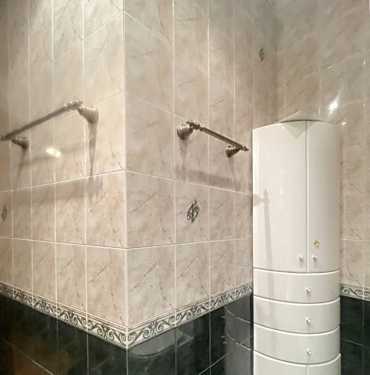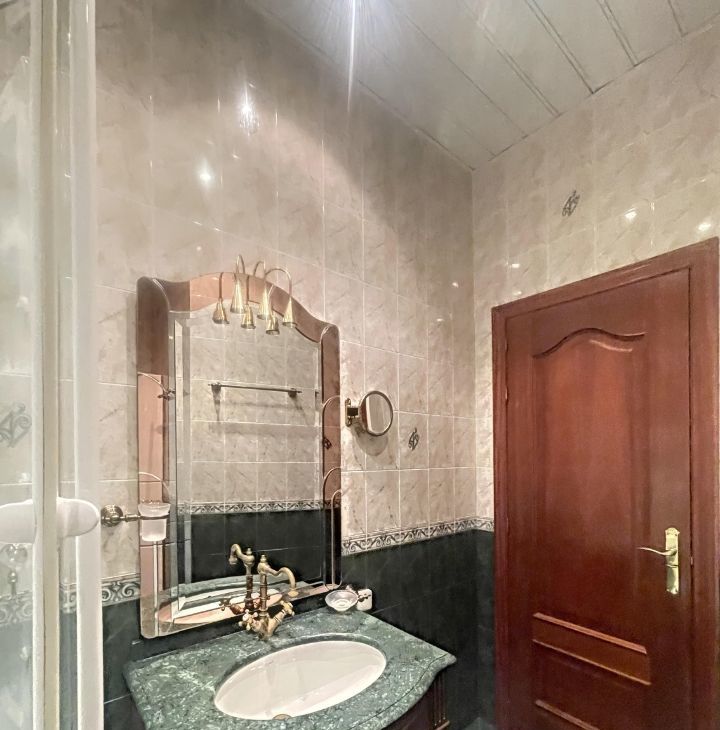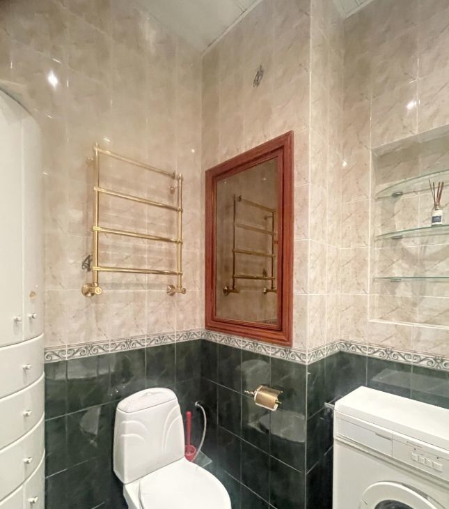 Совмещенный санузел с душевой, есть стиральная машинка, итальянская тумба с раковиной и зеркалом. Рядом функциональная гардеробная.