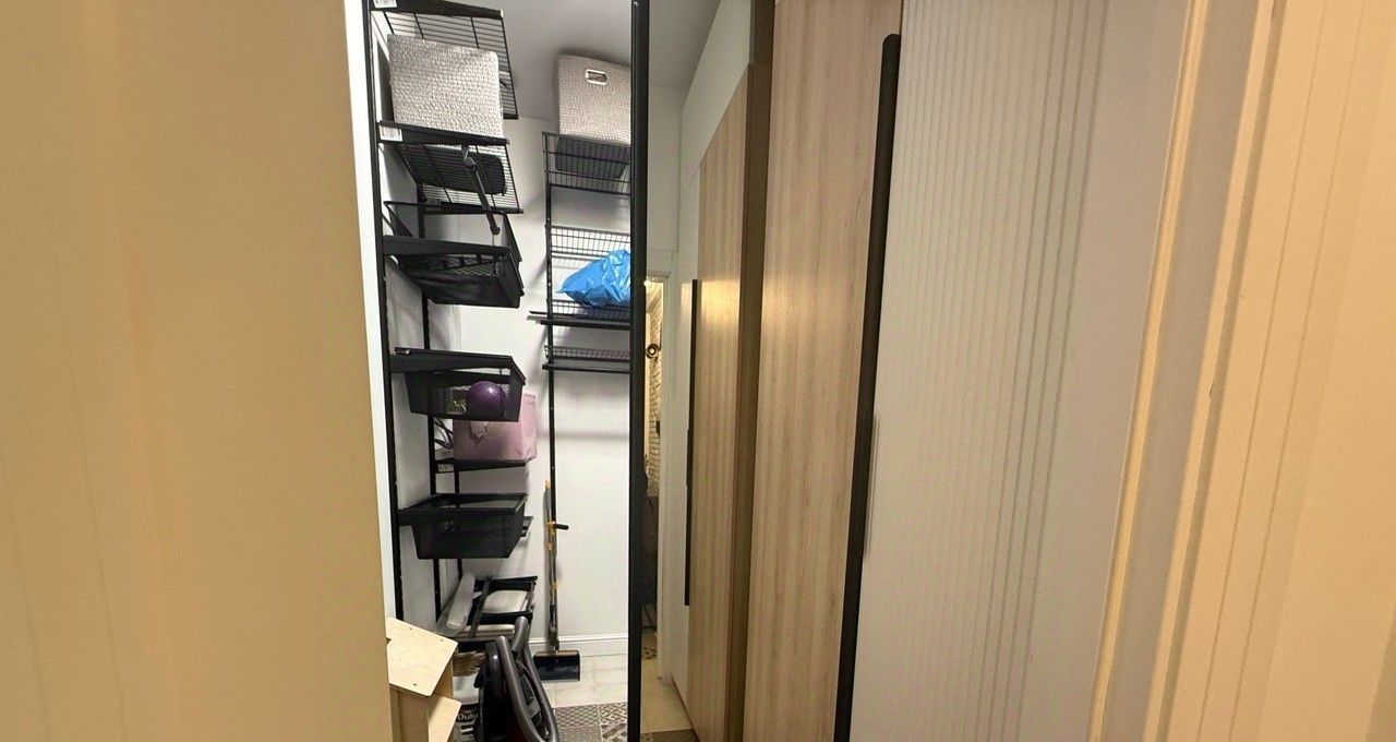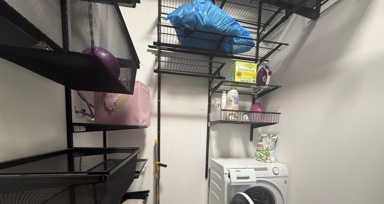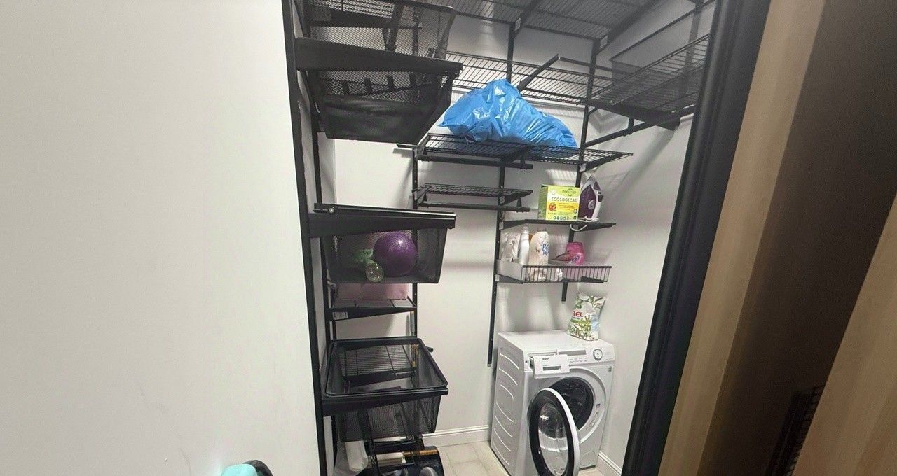 Вместительная гардеробная комната с выделенной зоной постирочной.