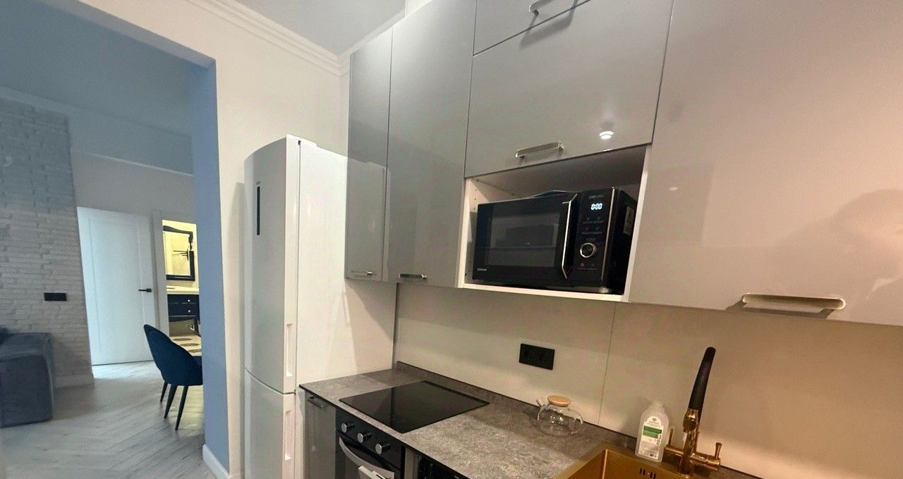 Полная комплектация: Квартира полностью меблирована и оснащена всей необходимой бытовой техникой от ведущих брендов (встроенная кухня, посудомоечная машина, холодильник, СВЧ). В наличии вся необходимая посуда и текстиль.