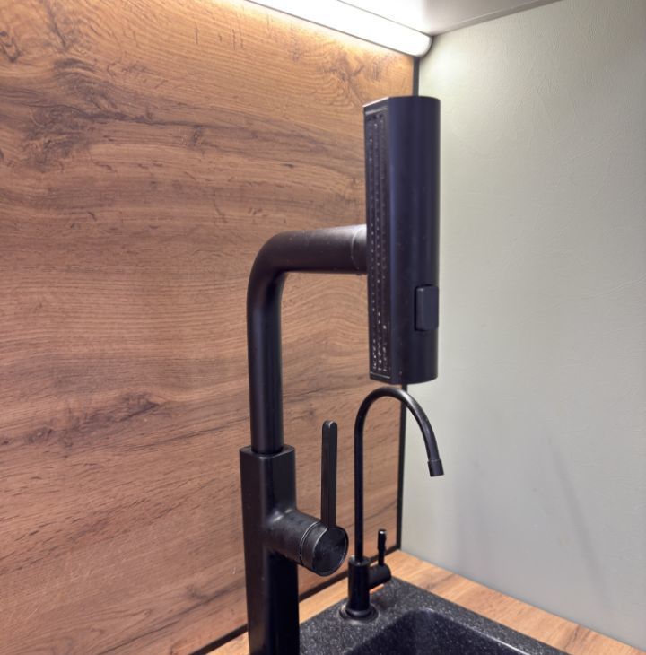 Кухонный гарнитур с необходимойтехникой (варочная индукционная панель, посудомоечная машина, стиральная машина, духовой шкаф, микроволновая печь, установлены фильтры для питьевой воды).
