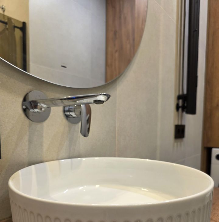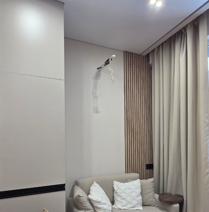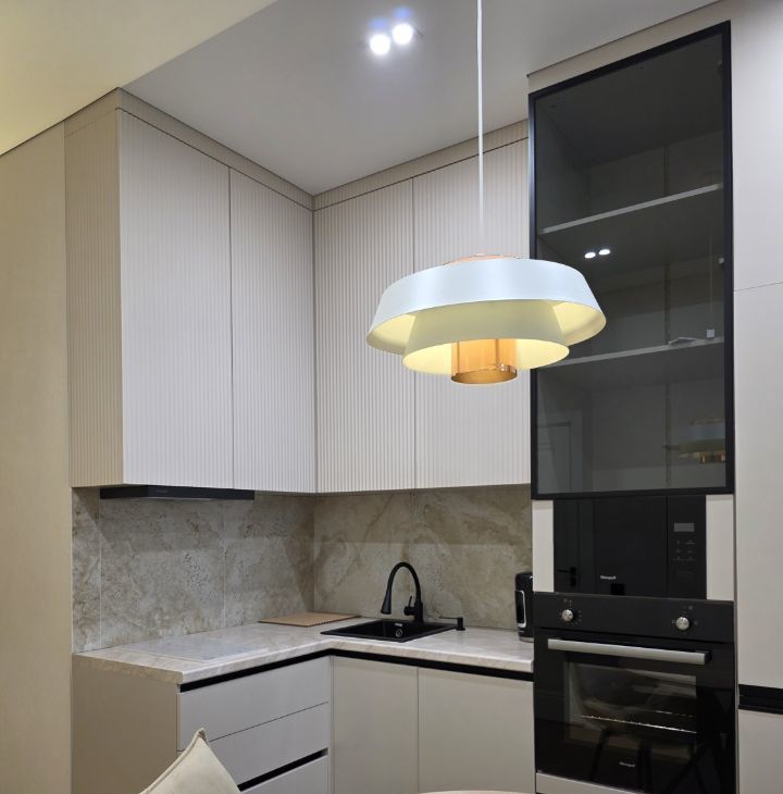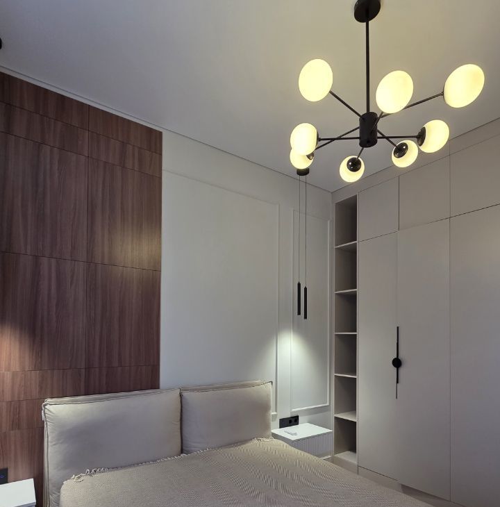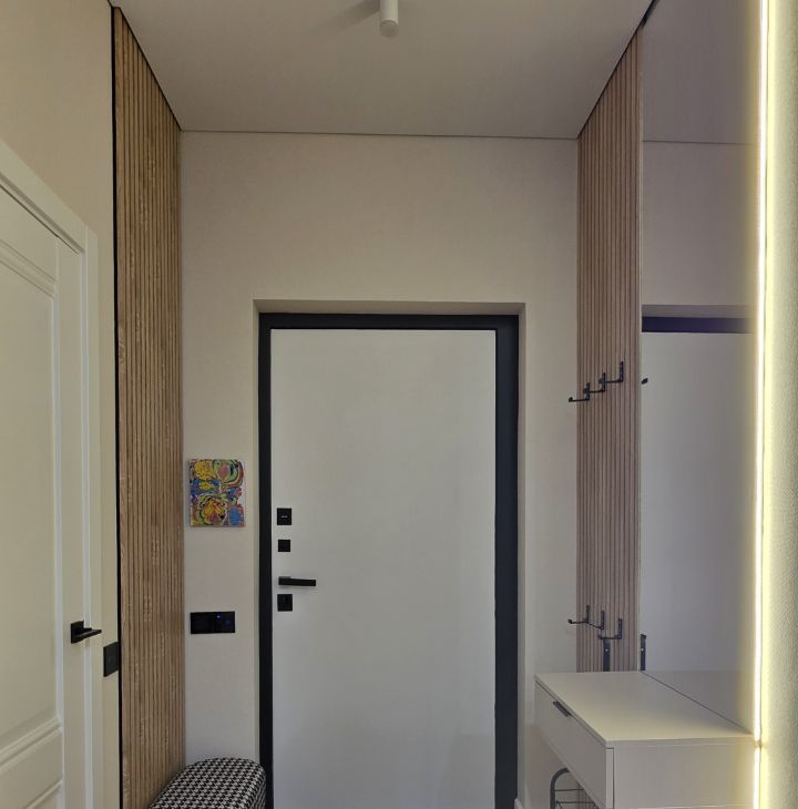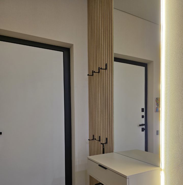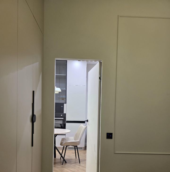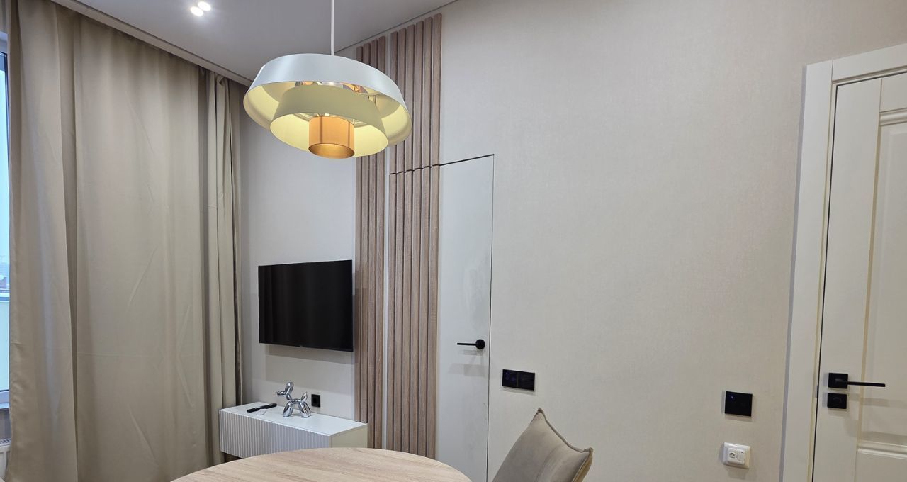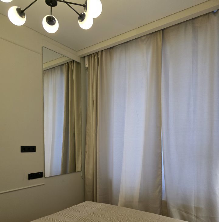 Везде зонированное освещение, в санузле теплый пол, электрокарнизы. Можно настроить "умный дом".