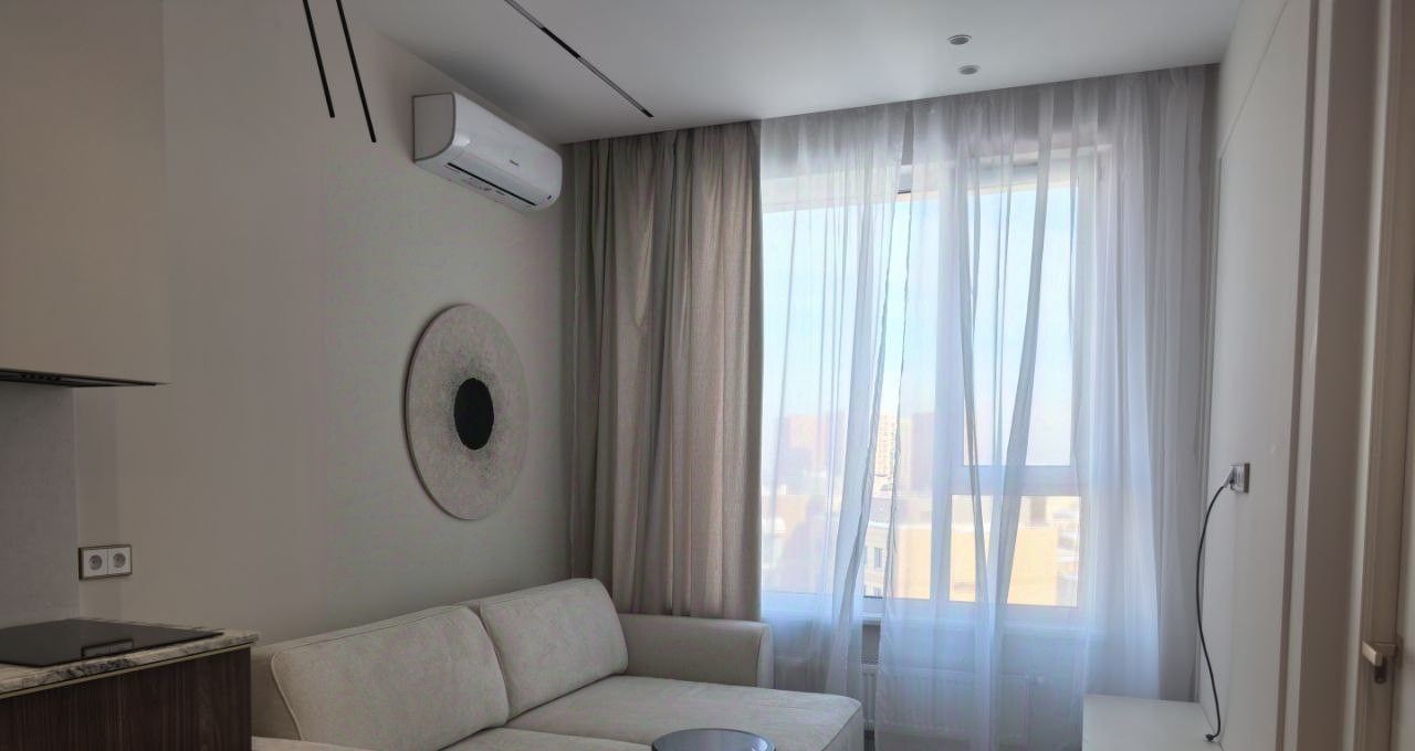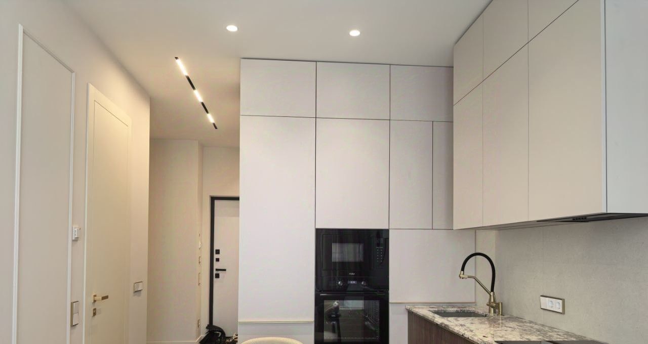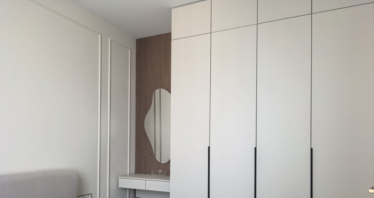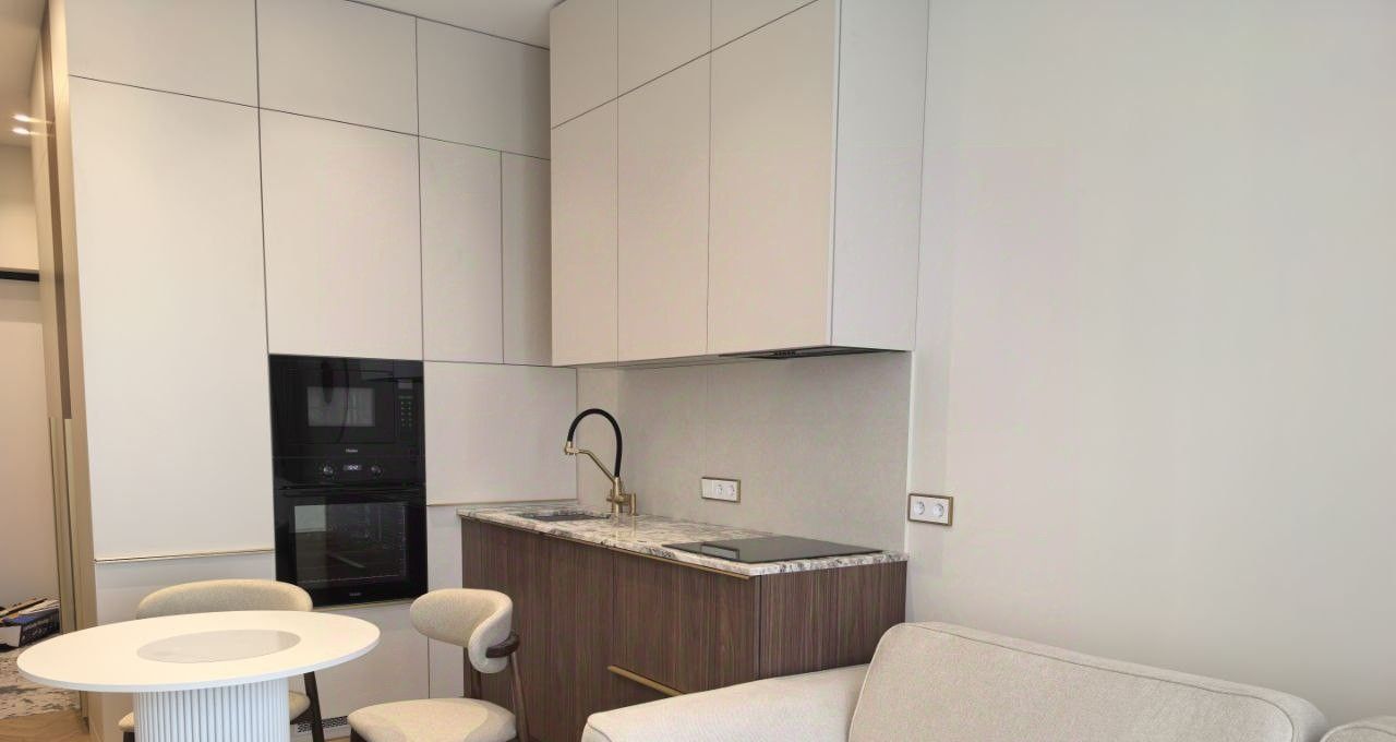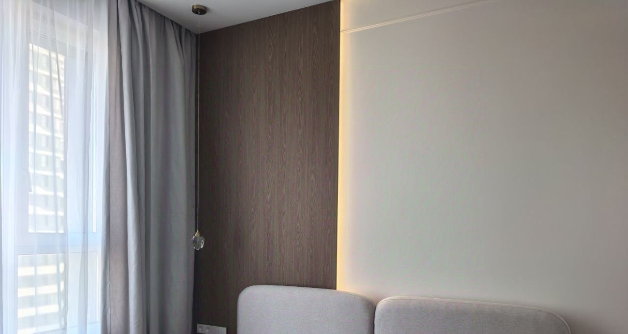 Квартира расположена на высоком 15-м этаже. Общая площадь — 43 м². Пространство продумано в концепции современного комфортного жилья: кухня-гостиная с мягкой диванной зоной и отдельная спальня. Интерьер выполнен по индивидуальному проекту для собственного проживания — с акцентом на эстетику, функциональность и обилие встроенных систем хранения. Использована дизайнерская мебель и качественные отделочные материалы.