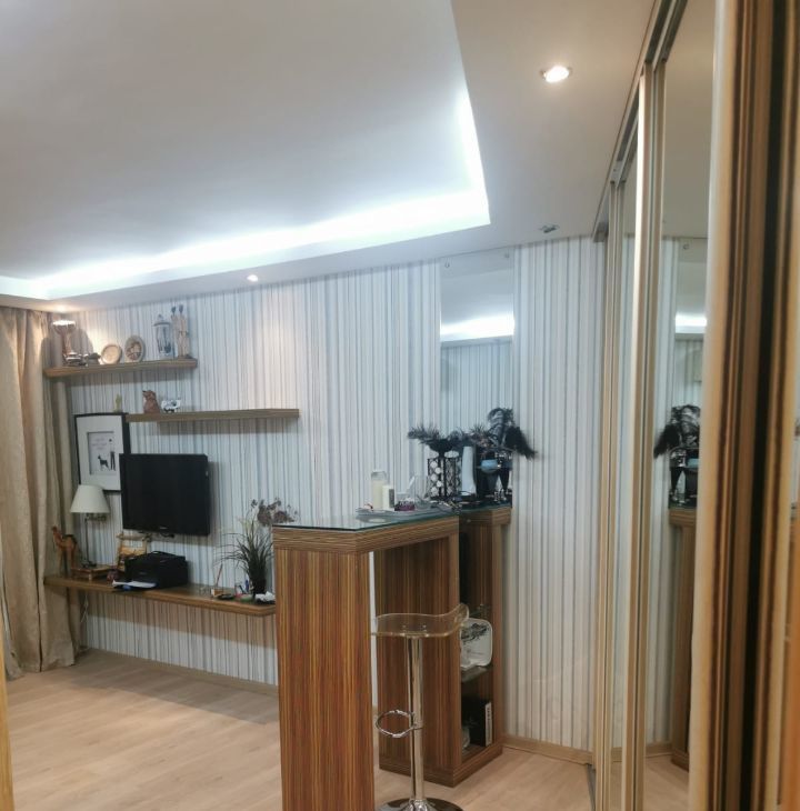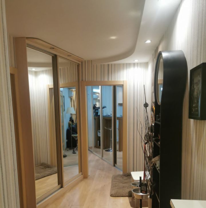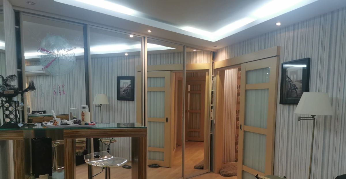 В гостинной комнате находится очень вместительная гардеробная с оборудованной системой стенохранения (внешне оформленная как шкаф-купэ), абсолютно легко можно зайти внутрь гардеробной и спокойно разложить вещи.