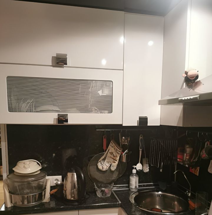 Кухня полностью укомплектована техническими и бытовыми предметами: плита, духовой шкаф, холодильник, микроволновая печь.