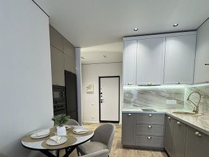 Площадь помещения 40 кв.м., имеется гостевой санузел, кухня-гостиная, а также мастер-спальня со своей гардеробной и санузлом. Квартира полностью мебелирована для комфортного проживания (стиральная машинка, варочная панель, духовой шкаф, холодильник, вытяжка, микроволновая печь, посудомоечная машинка, телевизор, кондиционер, электрический полотенцесушитель). Сделан качественный ремонт. Проведён высокоскоростной интернет. Квартира очень тёплая, автономно регулируемое отопление. Ранее никто не проживал!