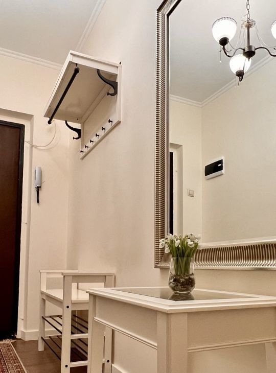 В спальне диван-кровать и небольшой книжный шкаф, телевизор. В другой светлой и просторной комнате гардероб и телевизор. Окна квартиры выходят на 2 стороны, во двор и на небольшую улицу. Санузел совмещен, облицован плиткой. В просторной прихожей есть платяной шкаф, зеркало, столик, вешалка и скамейка-подставка под обувь.