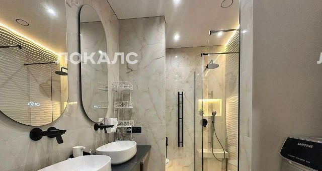 На кухне установлена посудомоечная машина и холодильник, а в ванной комнате — душевая кабина и стиральная машина.