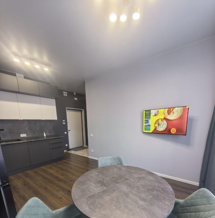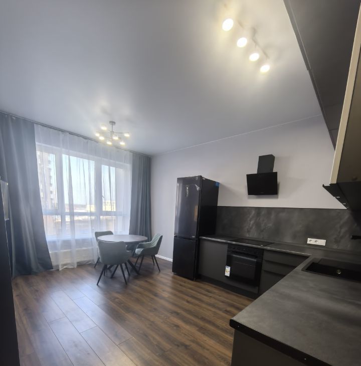 В квартире выполнен качественный евроремонт. В спальне и на кухне есть вся необходимая мебель (при необходимости готовы дополнительно приобрести небольшой диван во вторую комнату) . Кухня оборудована современной техникой: холодильник, посудомоечная машина и кондиционер. Ванная комната оснащена ванной и стиральной машиной. Для вашего удобства в квартире также есть телевизор. Окна выходят на улицу.