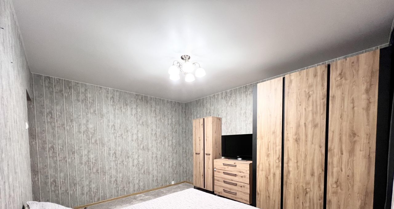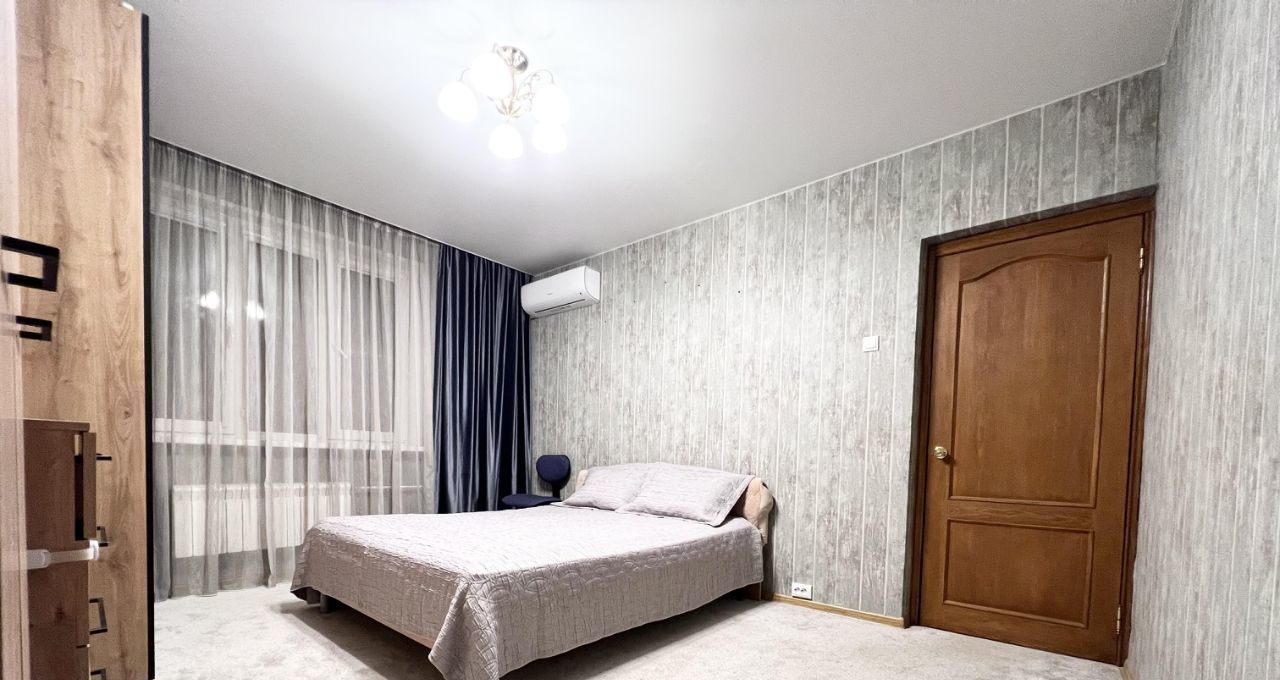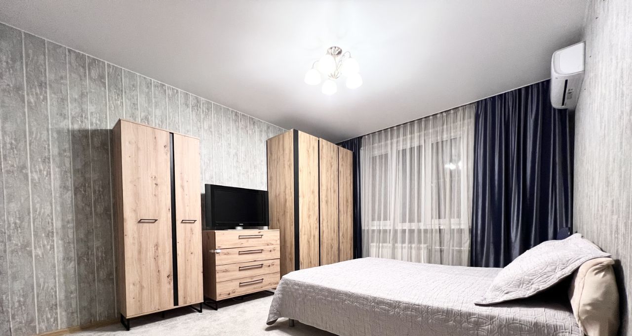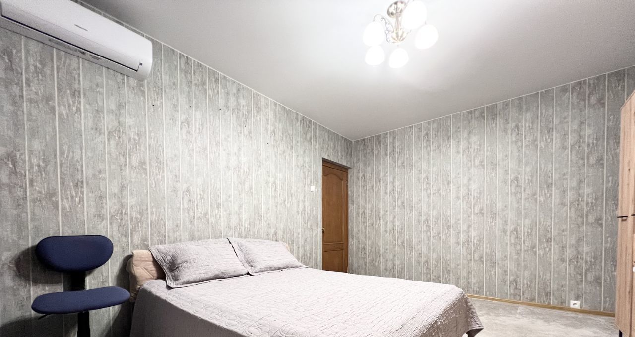 Спальня 15 кв м: двуспальная кровать с ортопедическим матрасом, 2 платяных шкафа, комод, ТВ Philips, офисный стул, кондиционер Hisense.