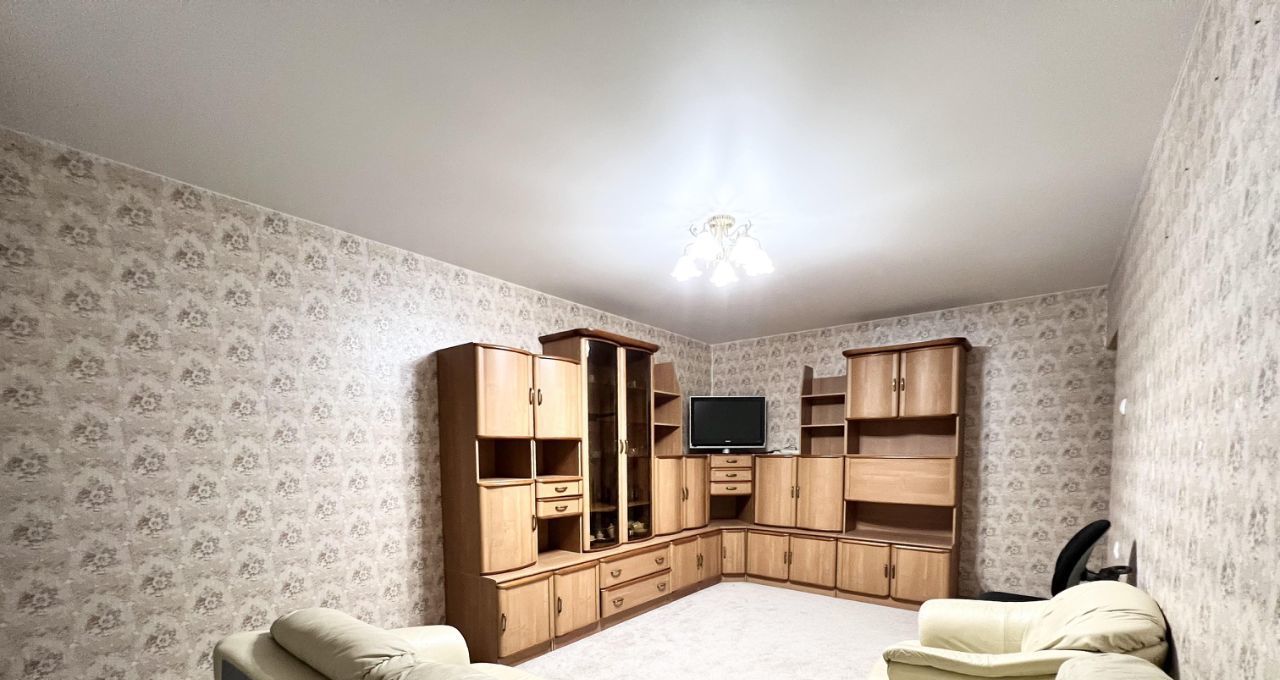 Гостиная 20 кв м: диван двуспальный угловой раскладной, стенка, ТВ Phillips, офисный стул.