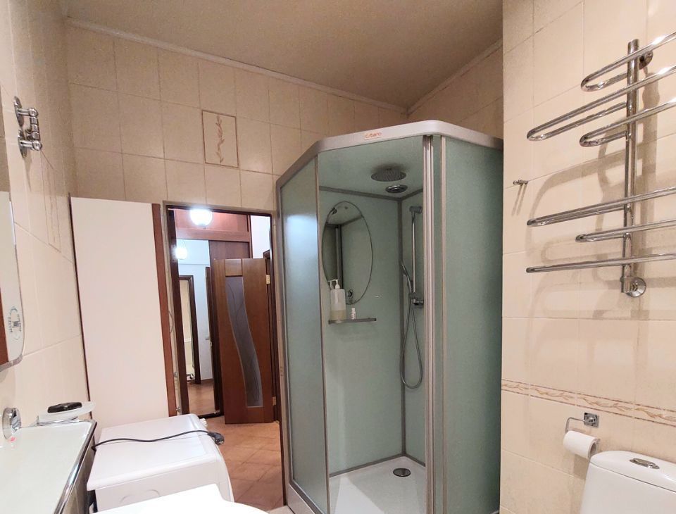 Большая ванная комната оснащена ванной и отдельно стоящей душевой кабиной, а также шкафом.
