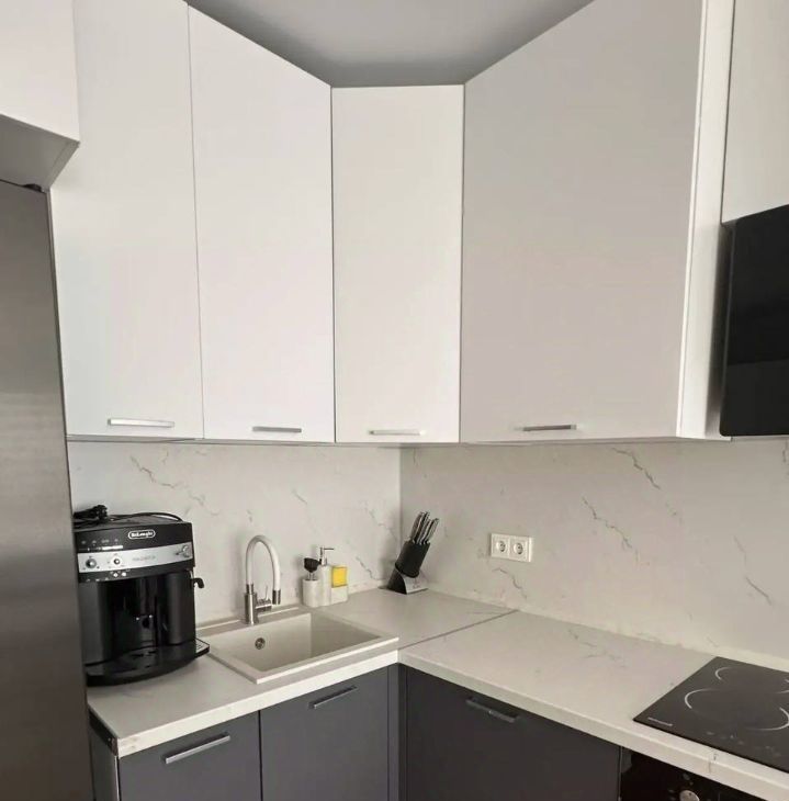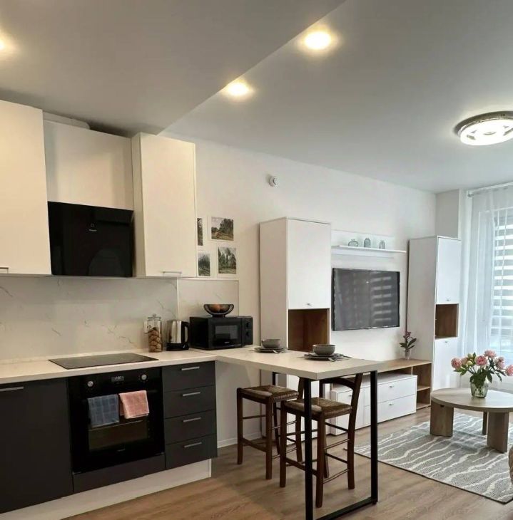 В зоне гостиной раскладной диван и ТВ, полностью оборудованная кухня: посуда, столовые приборы,блендер, кофемашина посудомоечная машина и т.д.