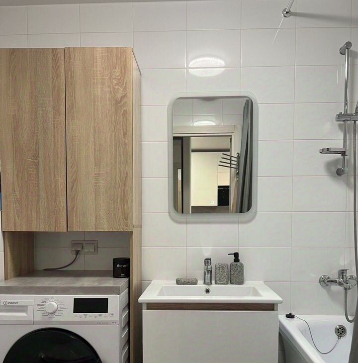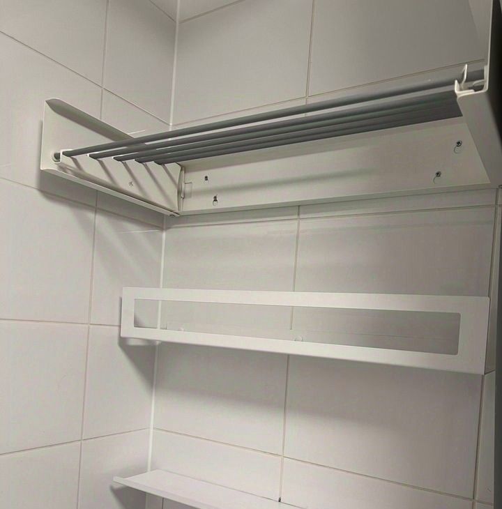 - в санузле водонагреватель в коллекторном узле, датчики протечек, мини-сушка. Есть также полноразмерная сушка и стремянка