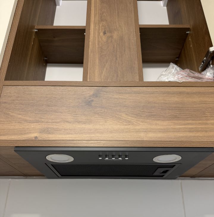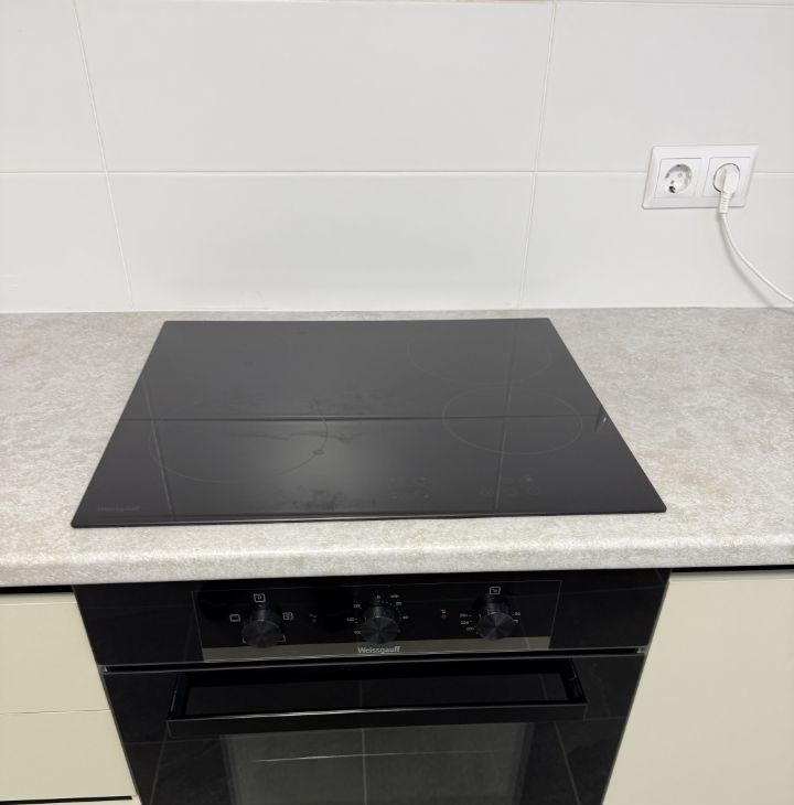 Кухня: чайник, холодильник, посудомоечная машина, духовой шкаф, вытяжка, варочная поверхность.