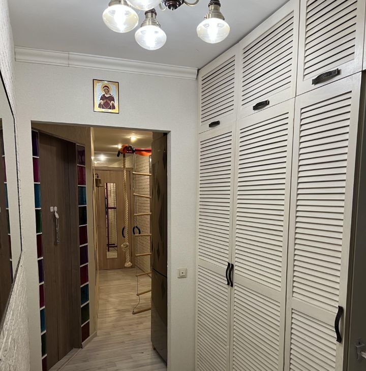 Квартира с функциональной планировкой: изолированные комнаты, просторная кухня-гостиная, холл со встроенными шкафами, совмещенный санузел с душевой кабиной.