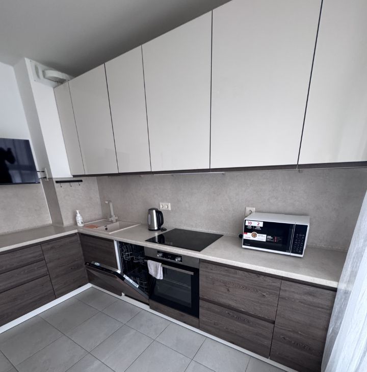 Кухня оборудована холодильником, свч, тв, посудомоечной машиной, духовкой, плитой, чайником, под раковиной установлен фильтр очистки воды.