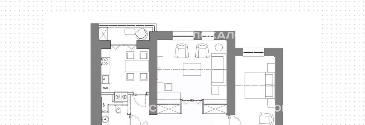 Планировка: кухня, объединённая с зоной лоджии, гостиная, спальня, санузел. Квартира укомплектована мебелью от Cosmo Relax, Unika Moblar, Masters и всей необходимой бытовой техникой брендов Bosch, Haier, Samsung. В гостиной оборудована зона кинозала со 100-дюймовым экраном для проектора и полностью оборудованная рабочая зона. На лоджии спланирована зона отдыха с массажным креслом и пуфом.