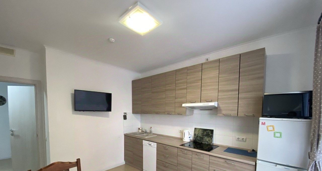 Есть вся необходимая мебель и техника. Встроенная кухня с техникой (холодильник, стеклокерамическая плита, вытяжка, СВЧ с функцией духовки, посудомоечная машина), обеденная группа, двуспальная кровать, раскладывающийся диван, 2 телевизора, стиральная машина, вместительный платяной шкаф, комод, письменный стол, книжный шкаф. ТВ, интернет.