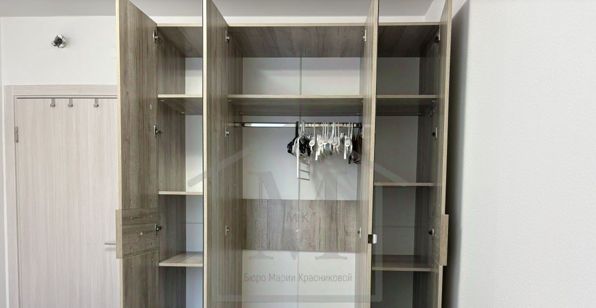 Хранение: Вместительный шкаф и тумбы в спальне, шкаф-купе в прихожей.