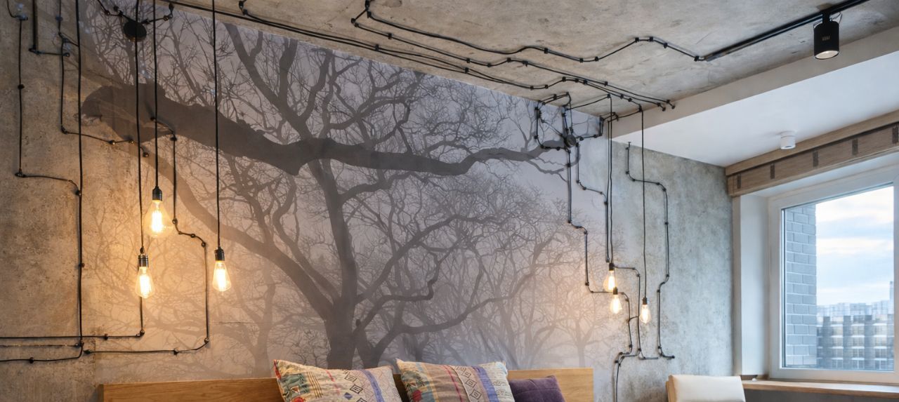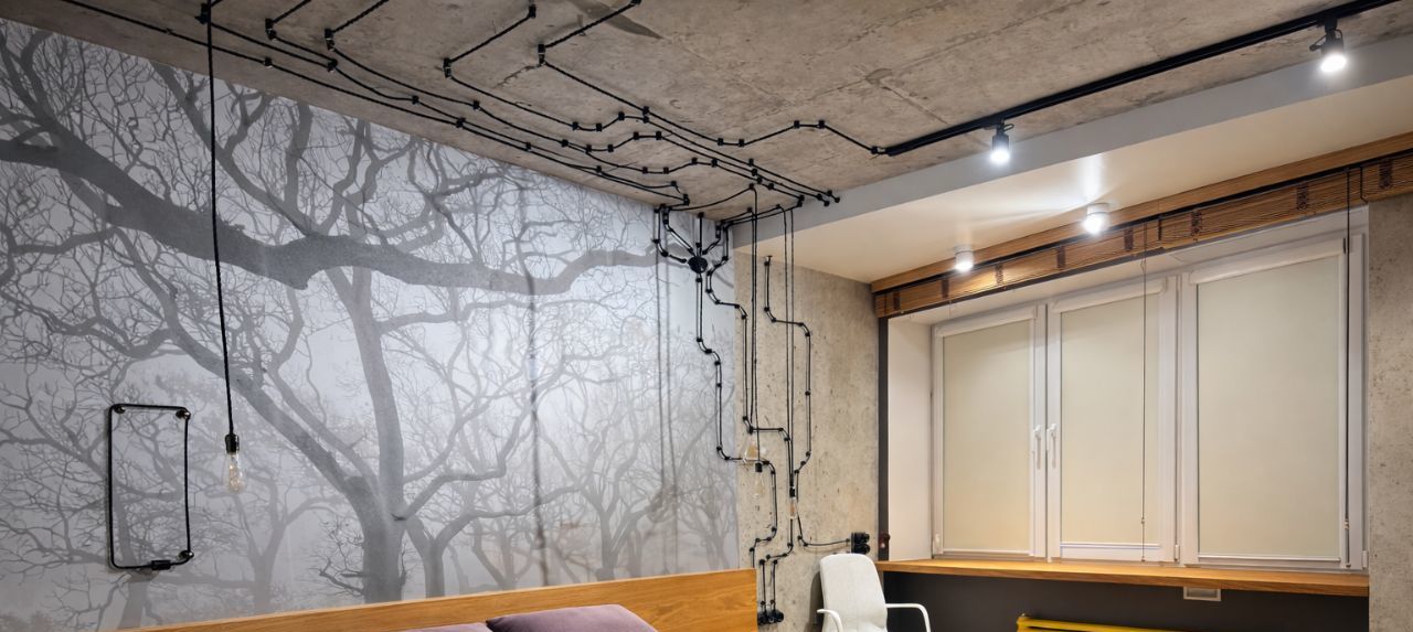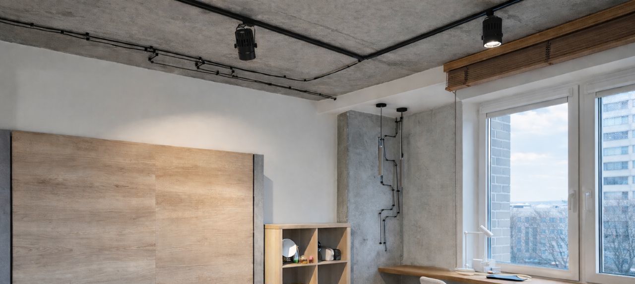 Квартира выполнена в современном стиле с элементами индустриального дизайна: бетонные фактуры, дерево, трековое и точечное освещение, акцентные детали. Большие окна делают пространство светлым и уютным в любое время года