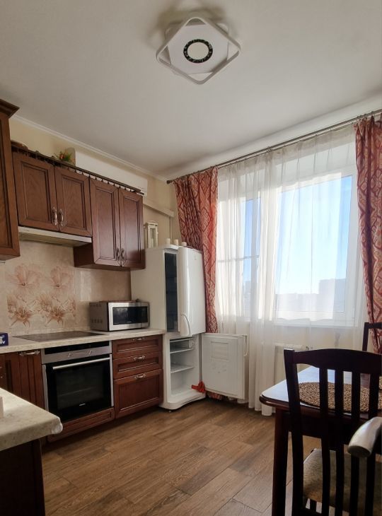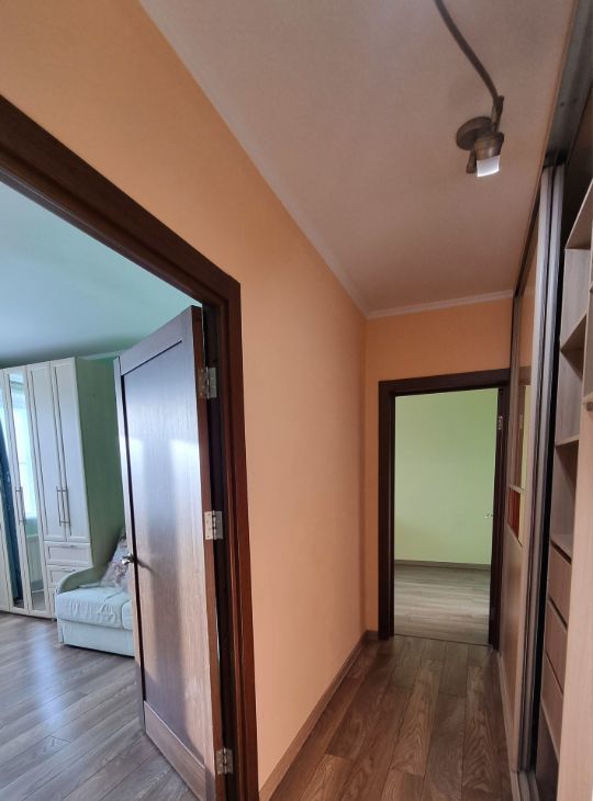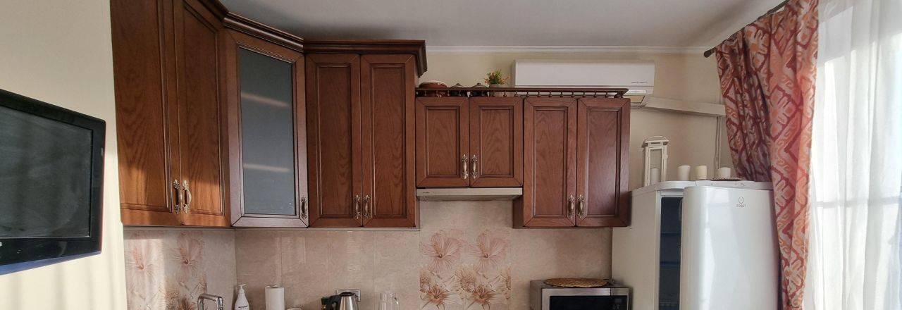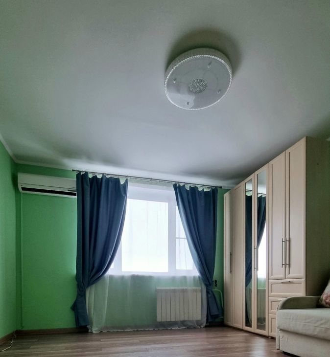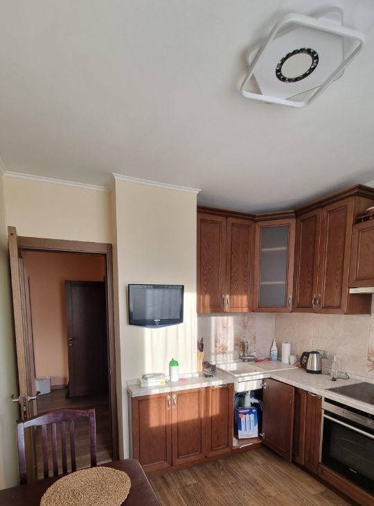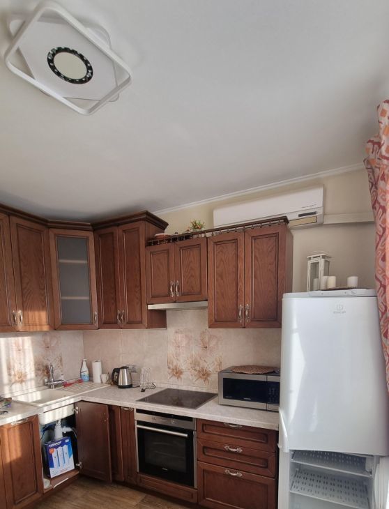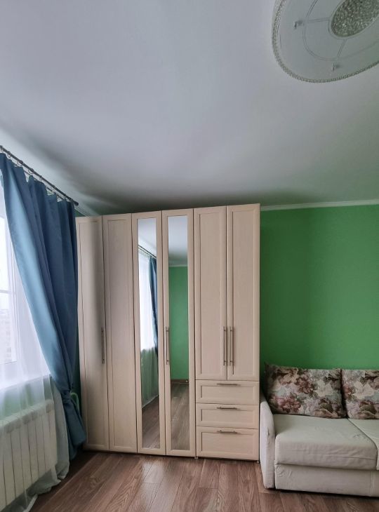 Квартира полностью готова для комфортного проживания: есть диван-кровать, шкафы, гардероб, детская мебель в маленькой комнате. Кухня полностью