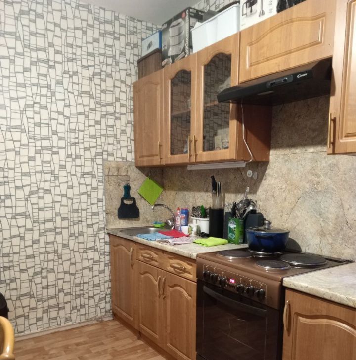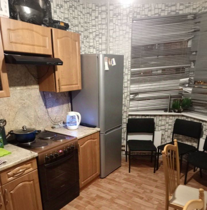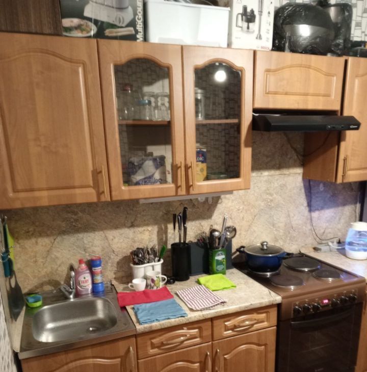 Кухня: кухонный гарнитур с нижними тумбами и верхними навесными шкафами, электрическая 4-х конфорочная плита, холодильник, раскладывающийся кухонный стол. Есть СВЧ-печка, кофемашина и другая кухонная техника (мультиварка, пароварка, блендер и т. д.), кухонная посуда и столовые приборы.