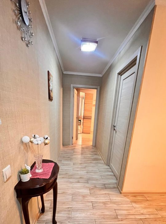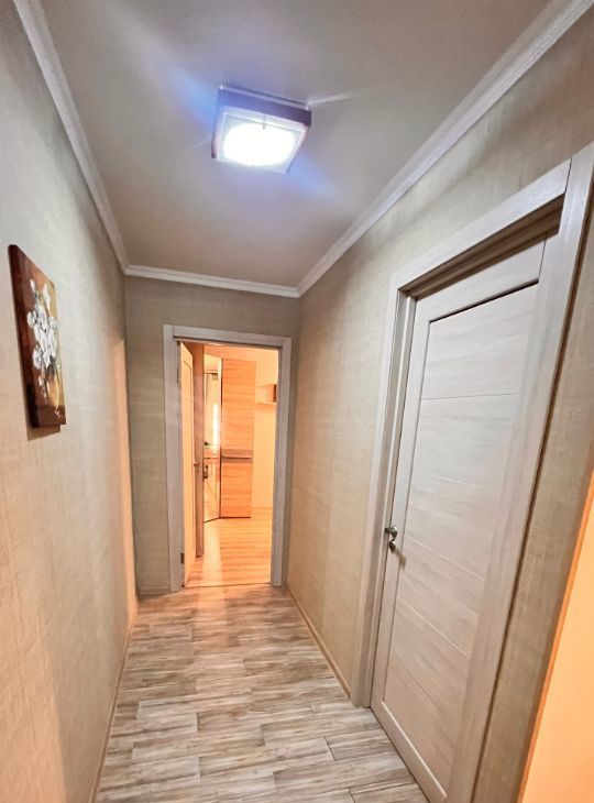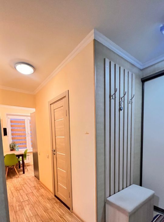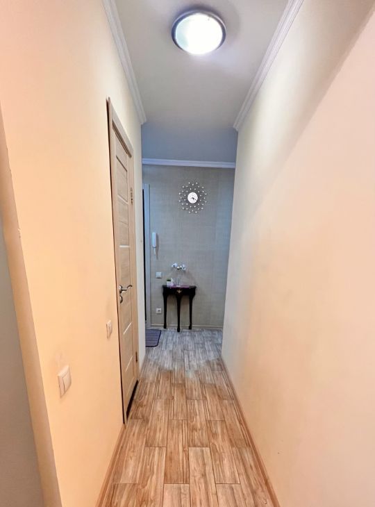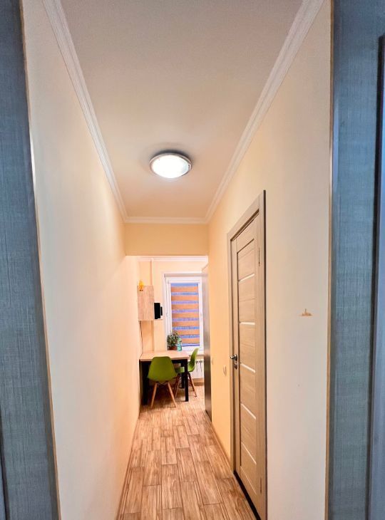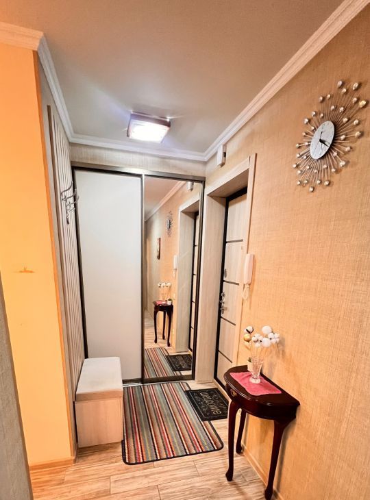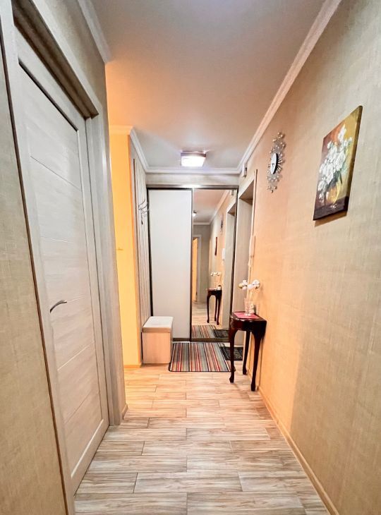 - Длинный функциональный коридор с зеркальным шкафом-купе и изолированным предбанником
