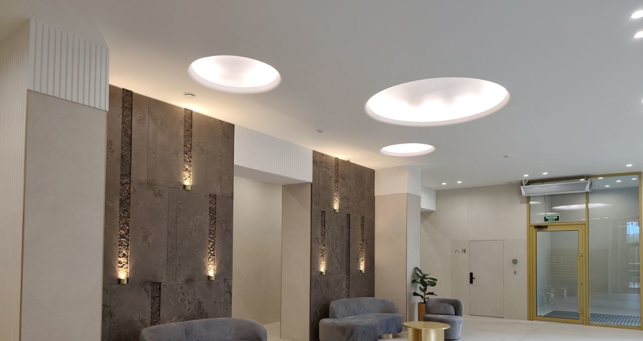 Дизайнерская отделка: натуральный дуб на полу, потолки со встроенной подсветкой, стены под покраску
