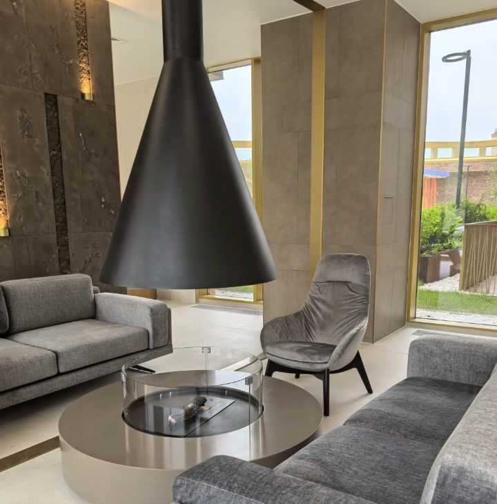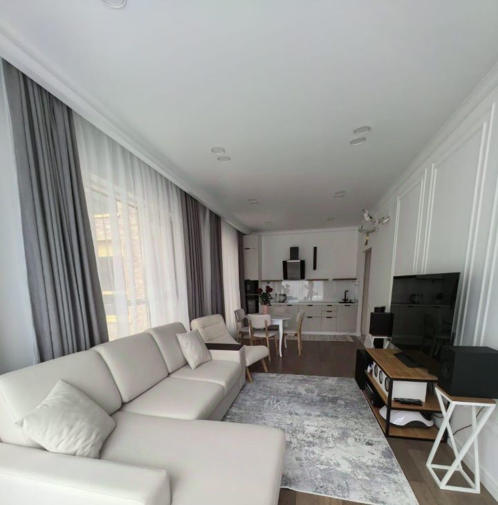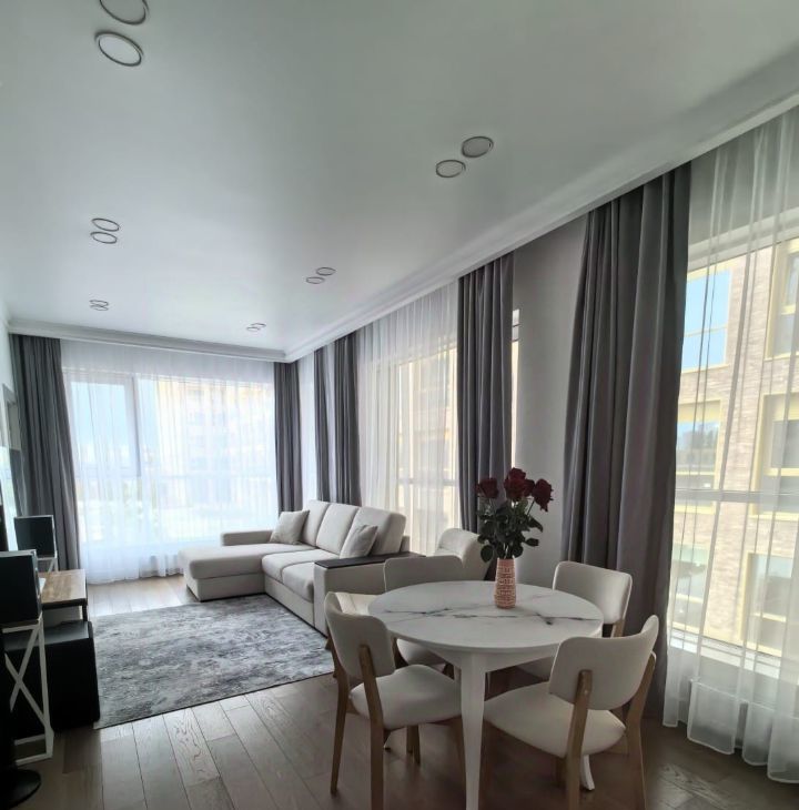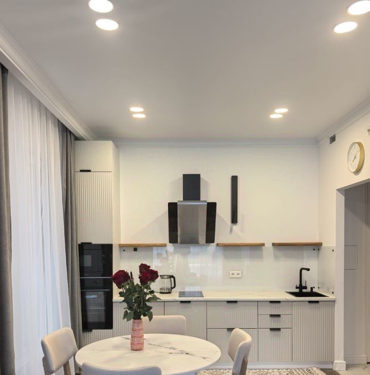 Просторная кухня-гостиная — 26 кв.м. Выполнена в дизайнерском стиле: стены отделаны стеклохолстом и покрашены, полы — инженерная доска, в коридоре и санузле — керамогранит. Сделаны подготовленные выводы под кондиционер и электрокарнизы.