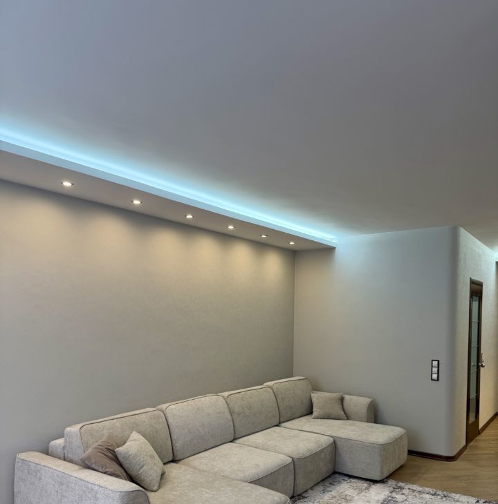 В гостиной установлен кондиционер, а также имеется новый телевизор и вместительный шкаф и тумба для хранения . Из мебели в комнате — удобный диван и шкафы. Площадь гостиной 35 кв.м.