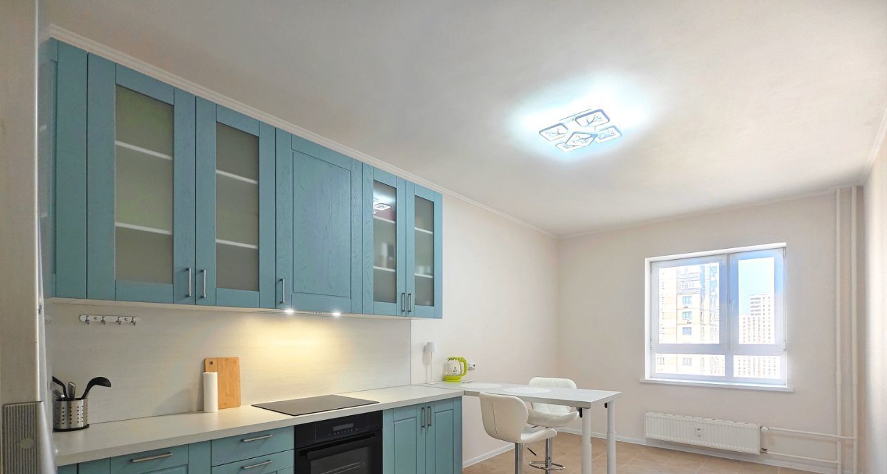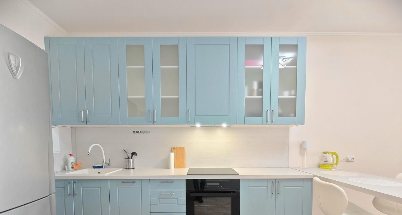 На кухне встроенный духовой шкаф, электрическая варочная панель. Холодильник с морозильной камерой, электрический чайник, вытяжка.