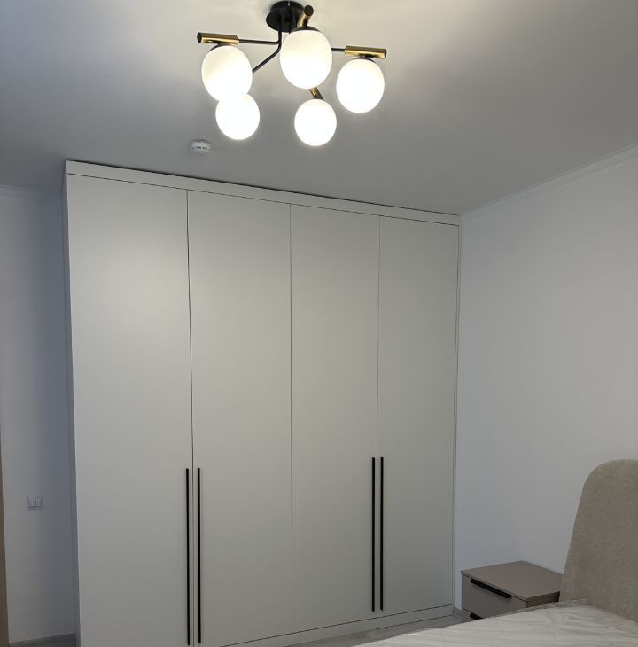 В спальне широкая двуспальная кровать, 4х-створчатый шкаф, рабочая зона с письменным столом и удобным креслом.