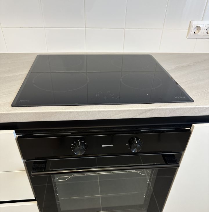 Кухня с набором встроенной бытовой техники: встроенный холодильник, духовой шкаф, стеклокерамическая варочная поверхность, посудомоечная машина на 45см, встроенная микроволновая печь и фильтр для воды.